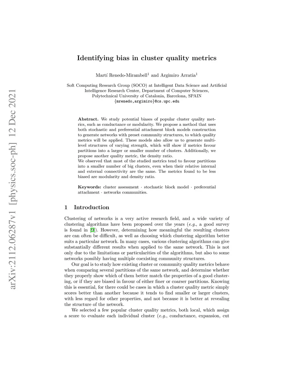 We study potential biases of popular cluster quality metrics, such as conductance or modularity. We propose a method that uses both stochastic and preferential attachment block models construction to generate networks with preset community structures, to which quality metrics will be applied. These models also allow us to generate multi-level structures of varying strength, which will show if metrics favour partitions into a larger or smaller number of clusters. Additionally, we propose another quality metric, the density ratio. We observed that most of the studied metrics tend to favour partitions into a smaller number of big clusters, even when their relative internal and external connectivity are the same. The metrics found to be less biased are modularity and density ratio.