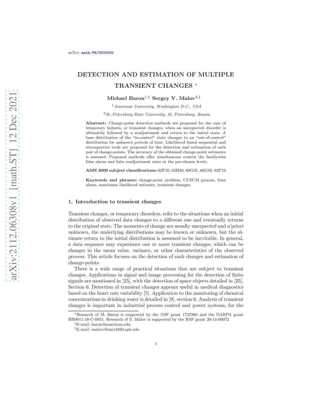 Change-point detection methods are proposed for the case of temporary failures, or transient changes, when an unexpected disorder is ultimately followed by a readjustment and return to the initial state. A base distribution of the "in-control" state changes to an "out-of-control" distribution for unknown periods of time. Likelihood based sequential and retrospective tools are proposed for the detection and estimation of each pair of change-points. The accuracy of the obtained change-point estimates is assessed. Proposed methods offer simultaneous control the familywise false alarm and false readjustment rates at the pre-chosen levels.