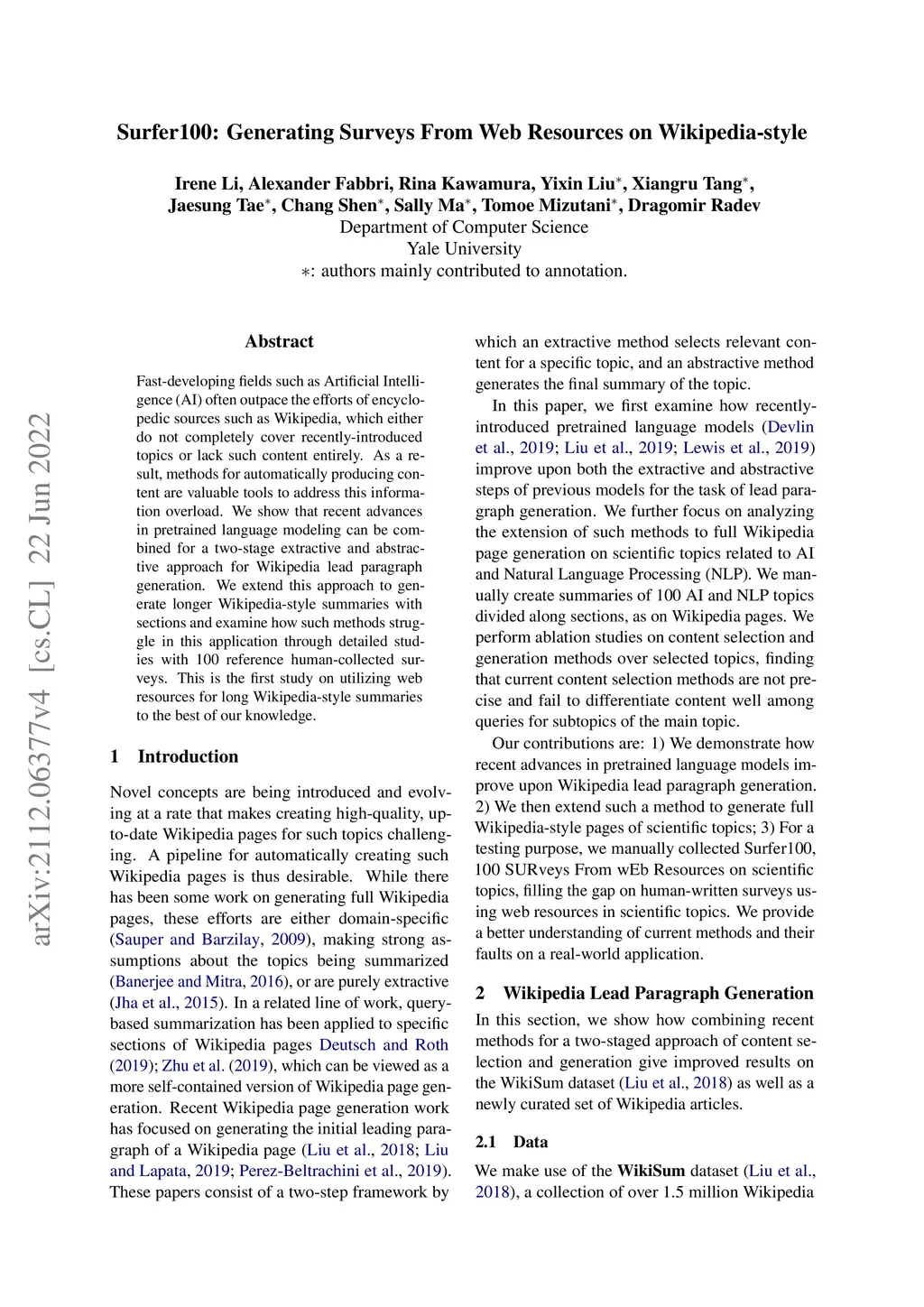 Surfer100: Generating Surveys From Web Resources, Wikipedia-style