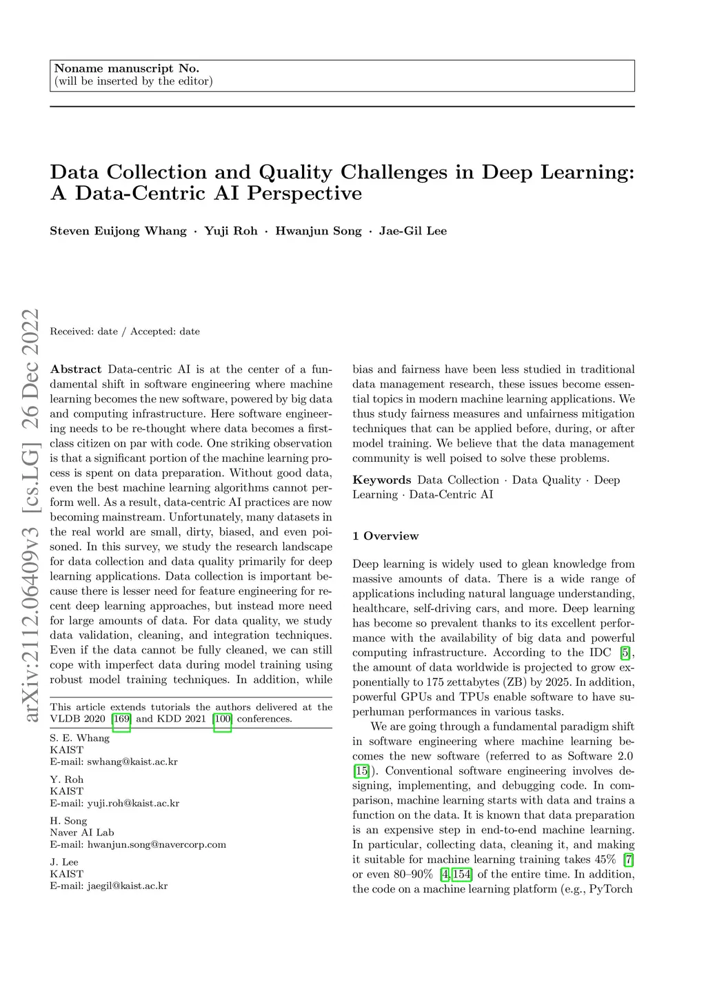 Data-centric AI is at the center of a fundamental shift in software engineering where machine learning becomes the new software, powered by big data and computing infrastructure. Here software engineering needs to be re-thought where data becomes a first-class citizen on par with code. One striking observation is that a significant portion of the machine learning process is spent on data preparation. Without good data, even the best machine learning algorithms cannot perform well. As a result, data-centric AI practices are now becoming mainstream. Unfortunately, many datasets in the real world are small, dirty, biased, and even poisoned. In this survey, we study the research landscape for data collection and data quality primarily for deep learning applications. Data collection is important because there is lesser need for feature engineering for recent deep learning approaches, but instead more need for large amounts of data. For data quality, we study data validation, cleaning, and integration techniques. Even if the data cannot be fully cleaned, we can still cope with imperfect data during model training using robust model training techniques. In addition, while bias and fairness have been less studied in traditional data management research, these issues become essential topics in modern machine learning applications. We thus study fairness measures and unfairness mitigation techniques that can be applied before, during, or after model training. We believe that the data management community is well poised to solve these problems.