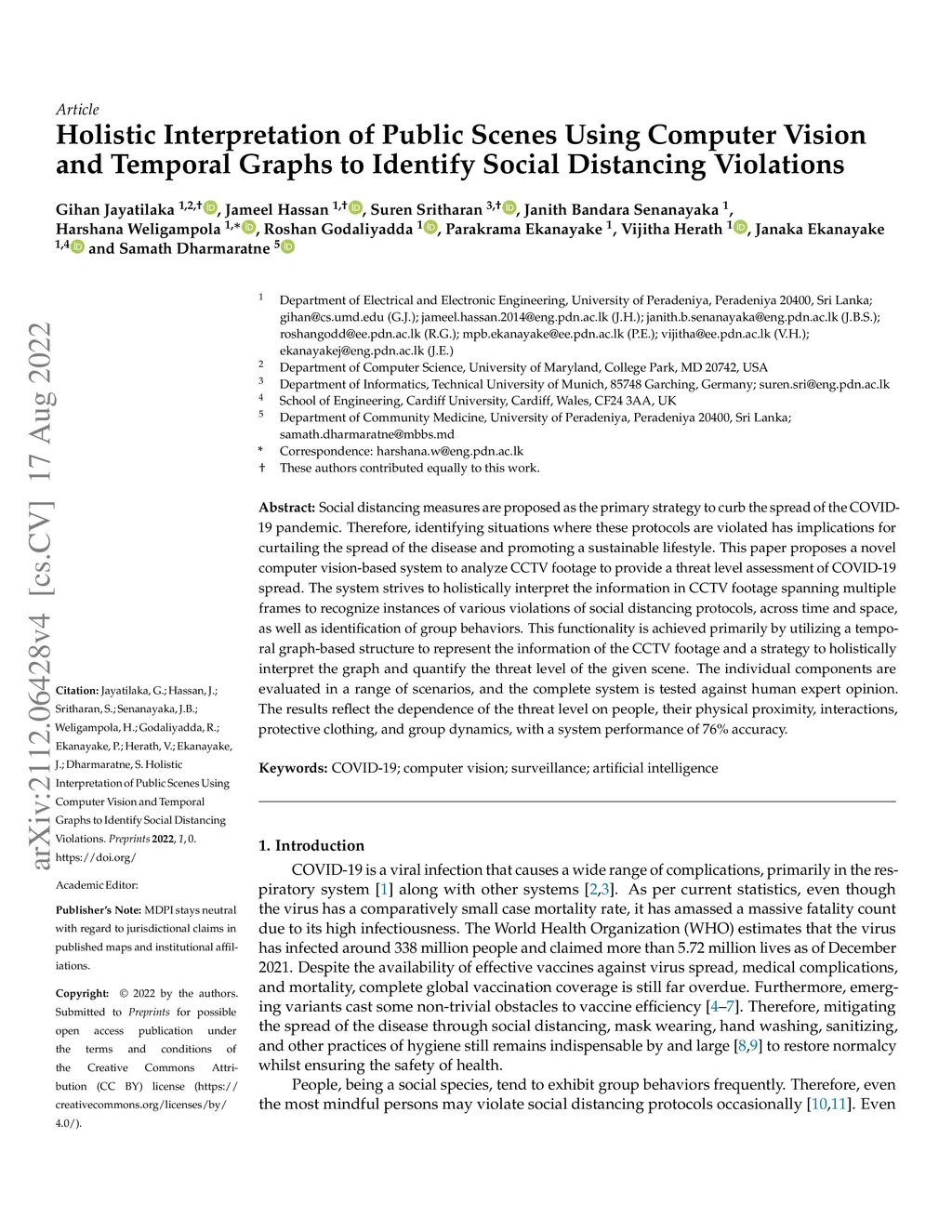 The COVID-19 pandemic has caused an unprecedented global public health crisis. Given its inherent nature, social distancing measures are proposed as the primary strategies to curb the spread of this pandemic. Therefore, identifying situations where these protocols are violated, has implications for curtailing the spread of the disease and promoting a sustainable lifestyle. This paper proposes a novel computer vision-based system to analyze CCTV footage to provide a threat level assessment of COVID-19 spread. The system strives to holistically capture and interpret the information content of CCTV footage spanning multiple frames to recognize instances of various violations of social distancing protocols, across time and space, as well as identification of group behaviors. This functionality is achieved primarily by utilizing a temporal graph-based structure to represent the information of the CCTV footage and a strategy to holistically interpret the graph and quantify the threat level of the given scene. The individual components are tested and validated on a range of scenarios and the complete system is tested against human expert opinion. The results reflect the dependence of the threat level on people, their physical proximity, interactions, protective clothing, and group dynamics. The system performance has an accuracy of 76%, thus enabling a deployable threat monitoring system in cities, to permit normalcy and sustainability in the society.