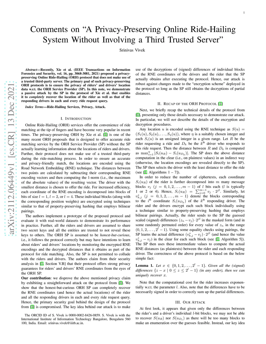 Comments on "A Privacy-Preserving Online Ride-Hailing System Without