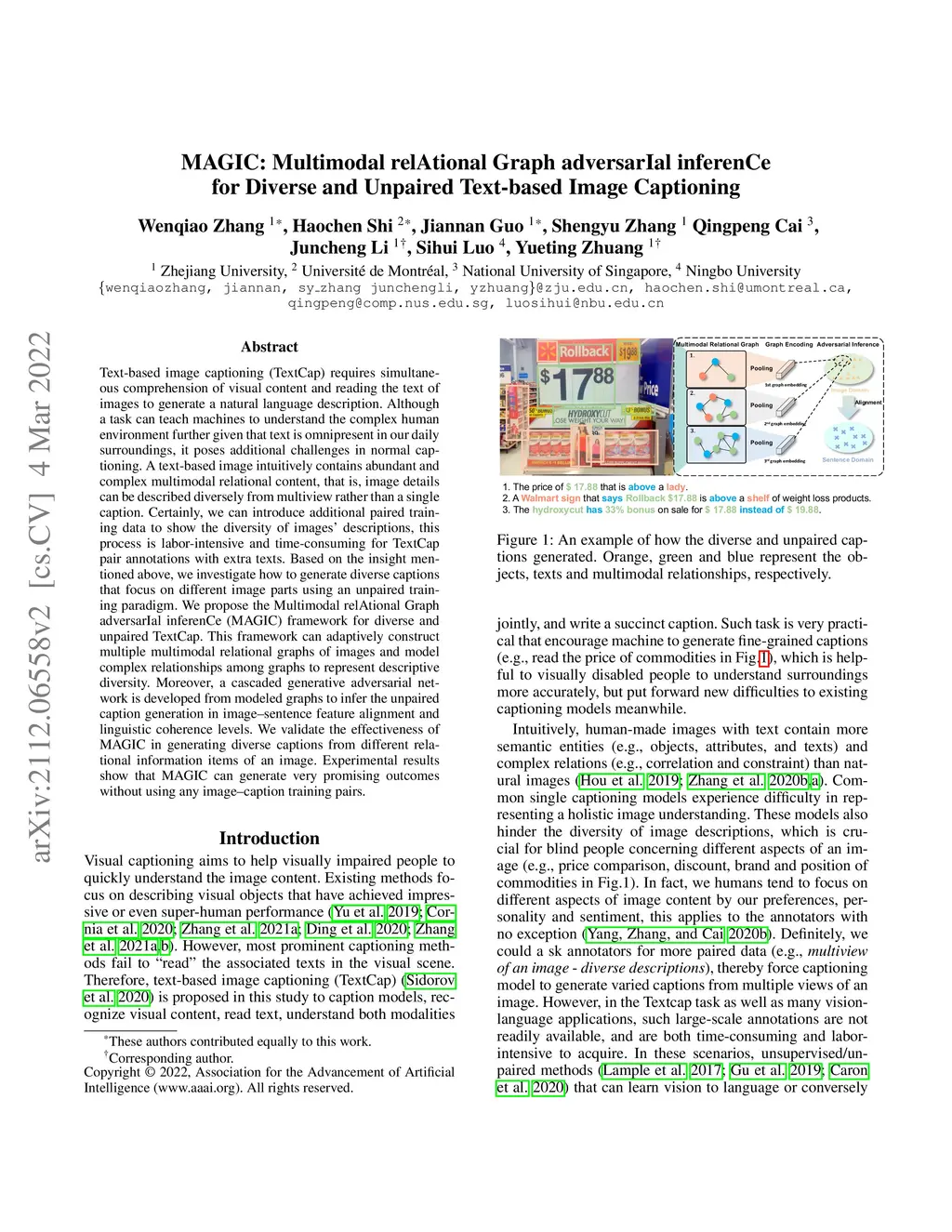 Text-based image captioning (TextCap) requires simultaneous comprehension of visual content and reading the text of images to generate a natural language description. Although a task can teach machines to understand the complex human environment further given that text is omnipresent in our daily surroundings, it poses additional challenges in normal captioning. A text-based image intuitively contains abundant and complex multimodal relational content, that is, image details can be described diversely from multiview rather than a single caption. Certainly, we can introduce additional paired training data to show the diversity of images' descriptions, this process is labor-intensive and time-consuming for TextCap pair annotations with extra texts. Based on the insight mentioned above, we investigate how to generate diverse captions that focus on different image parts using an unpaired training paradigm. We propose the Multimodal relAtional Graph adversarIal inferenCe (MAGIC) framework for diverse and unpaired TextCap. This framework can adaptively construct multiple multimodal relational graphs of images and model complex relationships among graphs to represent descriptive diversity. Moreover, a cascaded generative adversarial network is developed from modeled graphs to infer the unpaired caption generation in image-sentence feature alignment and linguistic coherence levels. We validate the effectiveness of MAGIC in generating diverse captions from different relational information items of an image. Experimental results show that MAGIC can generate very promising outcomes without using any image-caption training pairs.