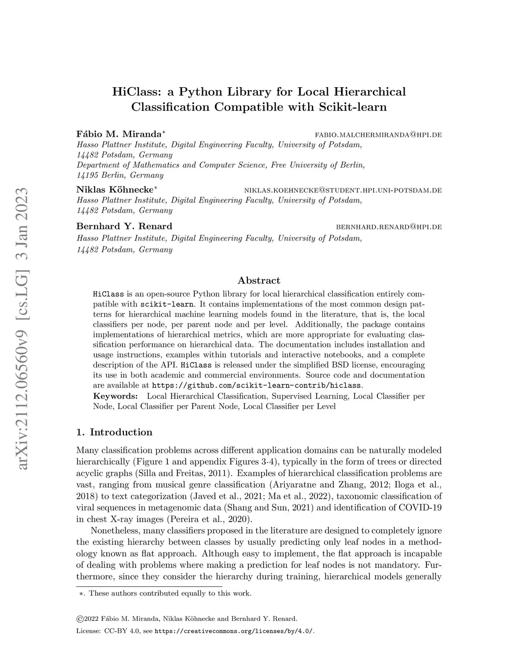 HiClass is an open-source Python library for local hierarchical classification entirely compatible with scikit-learn. It contains implementations of the most common design patterns for hierarchical machine learning models found in the literature, that is, the local classifiers per node, per parent node and per level. Additionally, the package contains implementations of hierarchical metrics, which are more appropriate for evaluating classification performance on hierarchical data. The documentation includes installation and usage instructions, examples within tutorials and interactive notebooks, and a complete description of the API. HiClass is released under the simplified BSD license, encouraging its use in both academic and commercial environments. Source code and documentation are available at https://github.com/scikit-learn-contrib/hiclass.