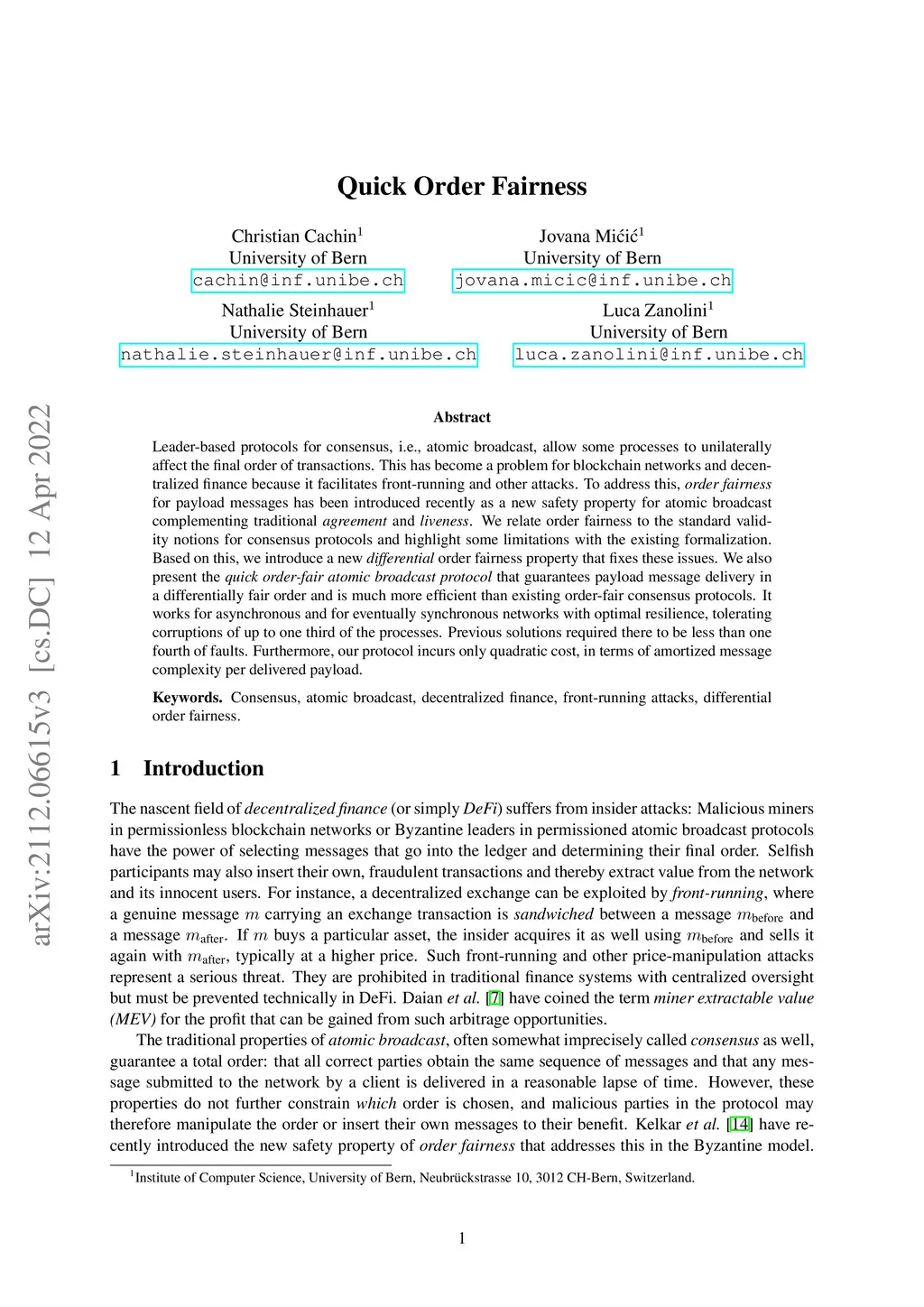Leader-based protocols for consensus, i.e., atomic broadcast, allow some processes to unilaterally affect the final order of transactions. This has become a problem for blockchain networks and decentralized finance because it facilitates front-running and other attacks. To address this, order fairness for payload messages has been introduced recently as a new safety property for atomic broadcast complementing traditional agreement and liveness. We relate order fairness to the standard validity notions for consensus protocols and highlight some limitations with the existing formalization. Based on this, we introduce a new differential order fairness property that fixes these issues. We also present the quick order-fair atomic broadcast protocol that guarantees payload message delivery in a differentially fair order and is much more efficient than existing order-fair consensus protocols. It works for asynchronous and for eventually synchronous networks with optimal resilience, tolerating corruptions of up to one third of the processes. Previous solutions required there to be less than one fourth of faults. Furthermore, our protocol incurs only quadratic cost, in terms of amortized message complexity per delivered payload.