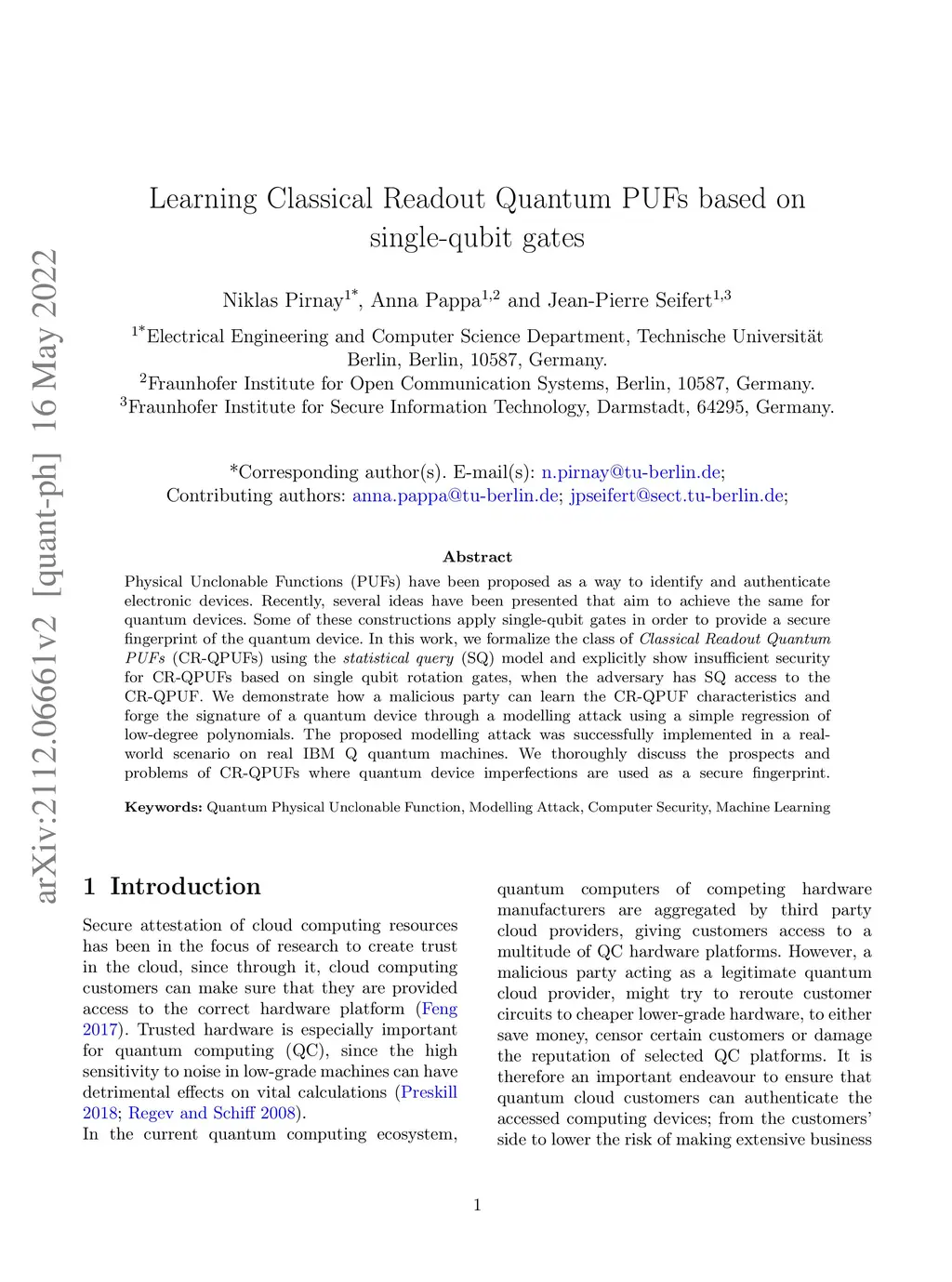 Physical Unclonable Functions (PUFs) have been proposed as a way to identify and authenticate electronic devices. Recently, several ideas have been presented that aim to achieve the same for quantum devices. Some of these constructions apply single-qubit gates in order to provide a secure fingerprint of the quantum device. In this work, we formalize the class of Classical Readout Quantum PUFs (CR-QPUFs) using the statistical query (SQ) model and explicitly show insufficient security for CR-QPUFs based on single qubit rotation gates, when the adversary has SQ access to the CR-QPUF. We demonstrate how a malicious party can learn the CR-QPUF characteristics and forge the signature of a quantum device through a modelling attack using a simple regression of low-degree polynomials. The proposed modelling attack was successfully implemented in a real-world scenario on real IBM Q quantum machines. We thoroughly discuss the prospects and problems of CR-QPUFs where quantum device imperfections are used as a secure fingerprint.