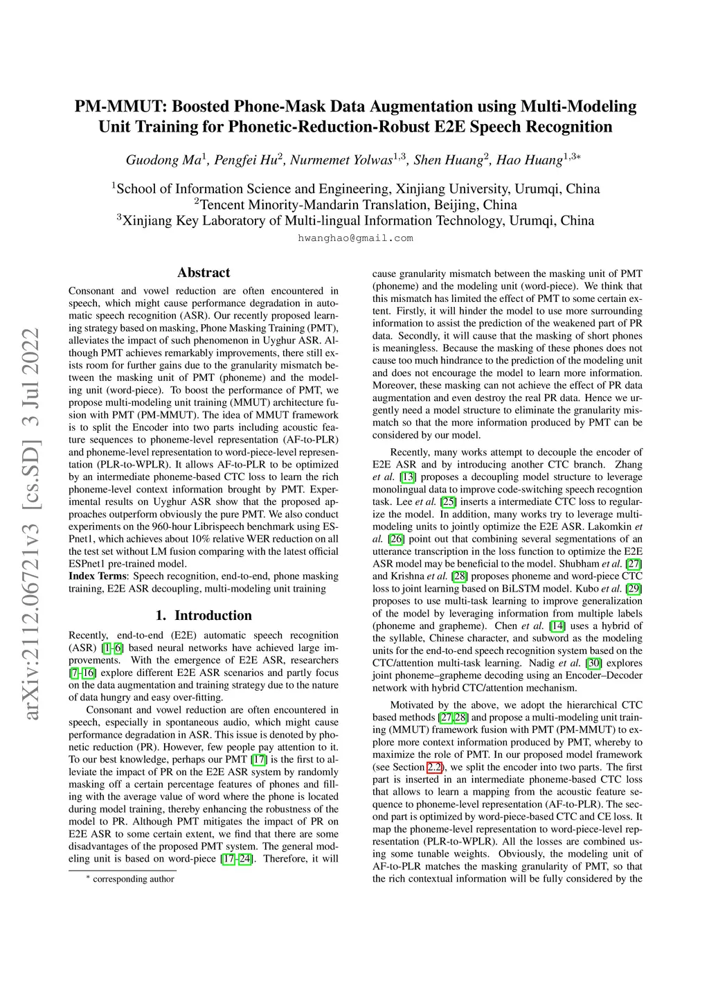 Consonant and vowel reduction are often encountered in speech, which might cause performance degradation in automatic speech recognition (ASR). Our recently proposed learning strategy based on masking, Phone Masking Training (PMT), alleviates the impact of such phenomenon in Uyghur ASR. Although PMT achieves remarkably improvements, there still exists room for further gains due to the granularity mismatch between the masking unit of PMT (phoneme) and the modeling unit (word-piece). To boost the performance of PMT, we propose multi-modeling unit training (MMUT) architecture fusion with PMT (PM-MMUT). The idea of MMUT framework is to split the Encoder into two parts including acoustic feature sequences to phoneme-level representation (AF-to-PLR) and phoneme-level representation to word-piece-level representation (PLR-to-WPLR). It allows AF-to-PLR to be optimized by an intermediate phoneme-based CTC loss to learn the rich phoneme-level context information brought by PMT. Experimental results on Uyghur ASR show that the proposed approaches outperform obviously the pure PMT. We also conduct experiments on the 960-hour Librispeech benchmark using ESPnet1, which achieves about 10% relative WER reduction on all the test set without LM fusion comparing with the latest official ESPnet1 pre-trained model.