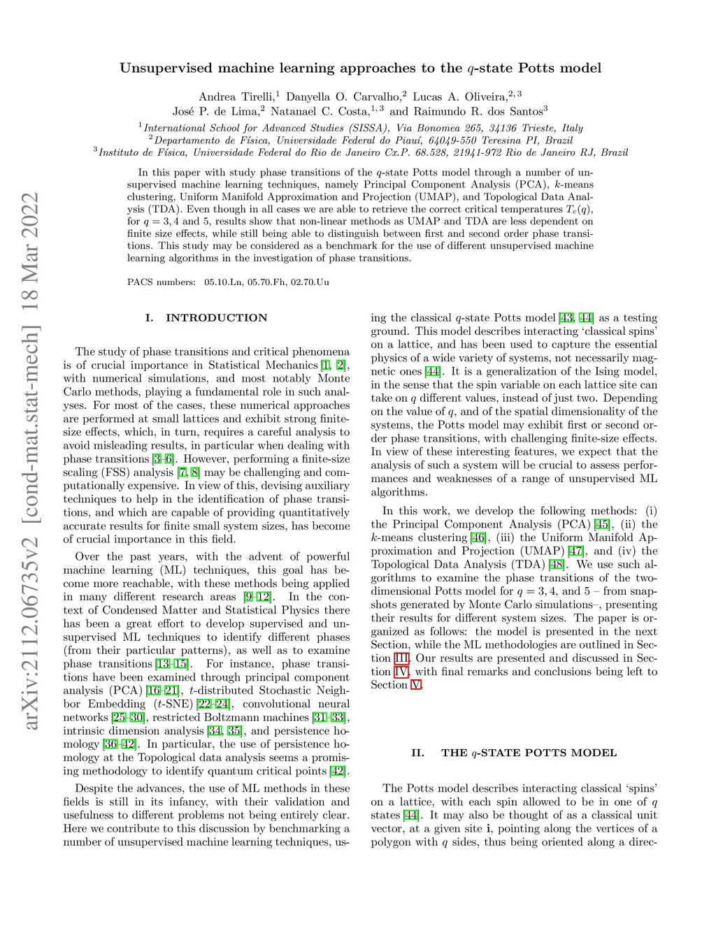 In this paper with study phase transitions of the -state Potts model, through a number of unsupervised machine learning techniques, namely Principal Component Analysis (PCA), -means clustering, Uniform Manifold Approximation and Projection (UMAP), and Topological Data Analysis (TDA). Even though in all cases we are able to retrieve the correct critical temperatures , for and , results show that non-linear methods as UMAP and TDA are less dependent on finite size effects, while still being able to distinguish between first and second order phase transitions. This study may be considered as a benchmark for the use of different unsupervised machine learning algorithms in the investigation of phase transitions.