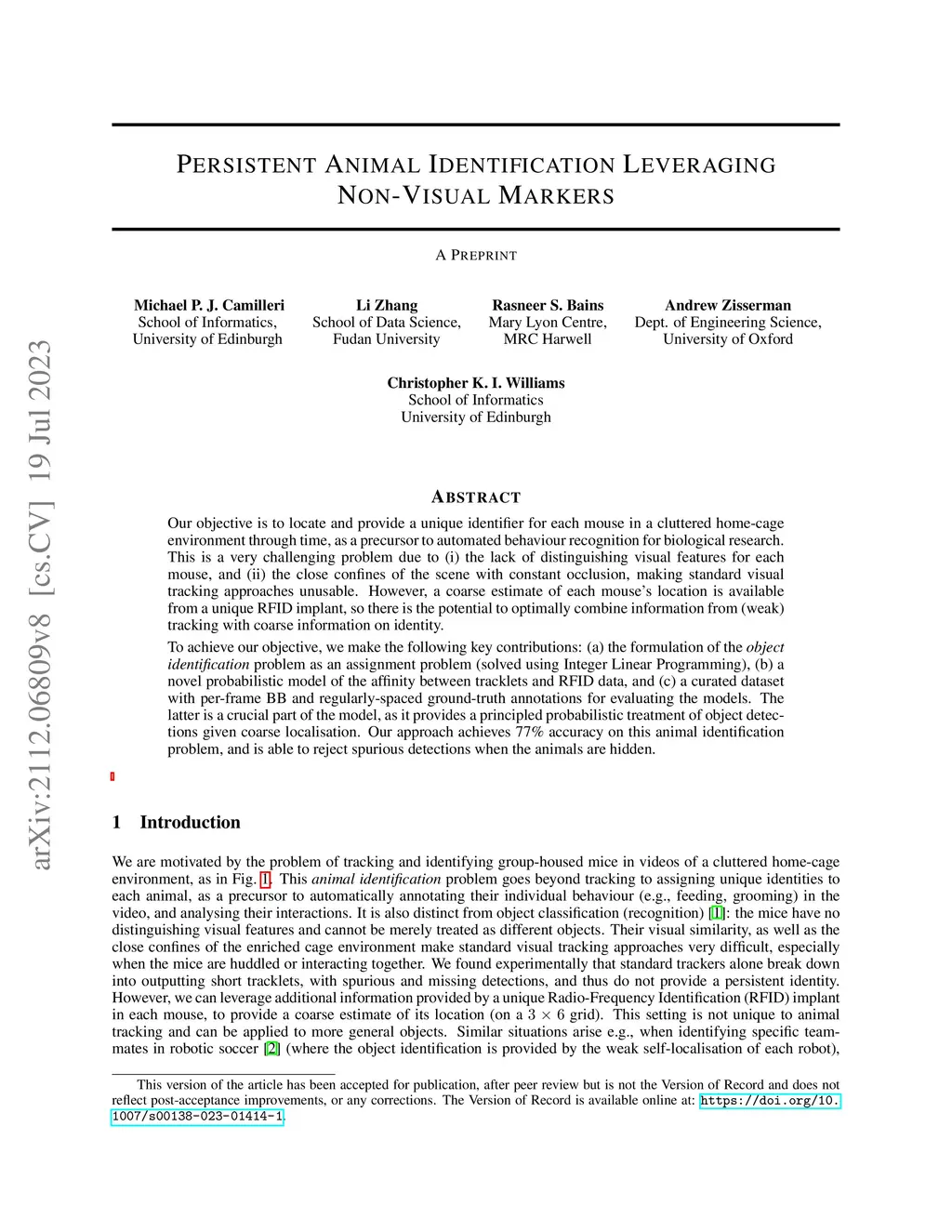 Our objective is to locate and provide a unique identifier for each mouse in a cluttered home-cage environment through time, as a precursor to automated behaviour recognition for biological research. This is a very challenging problem due to (i) the lack of distinguishing visual features for each mouse, and (ii) the close confines of the scene with constant occlusion, making standard visual tracking approaches unusable. However, a coarse estimate of each mouse's location is available from a unique RFID implant, so there is the potential to optimally combine information from (weak) tracking with coarse information on identity. To achieve our objective, we make the following key contributions: (a) the formulation of the object identification problem as an assignment problem (solved using Integer Linear Programming), and (b) a novel probabilistic model of the affinity between tracklets and RFID data. The latter is a crucial part of the model, as it provides a principled probabilistic treatment of object detections given coarse localisation. Our approach achieves 77% accuracy on this animal identification problem, and is able to reject spurious detections when the animals are hidden.