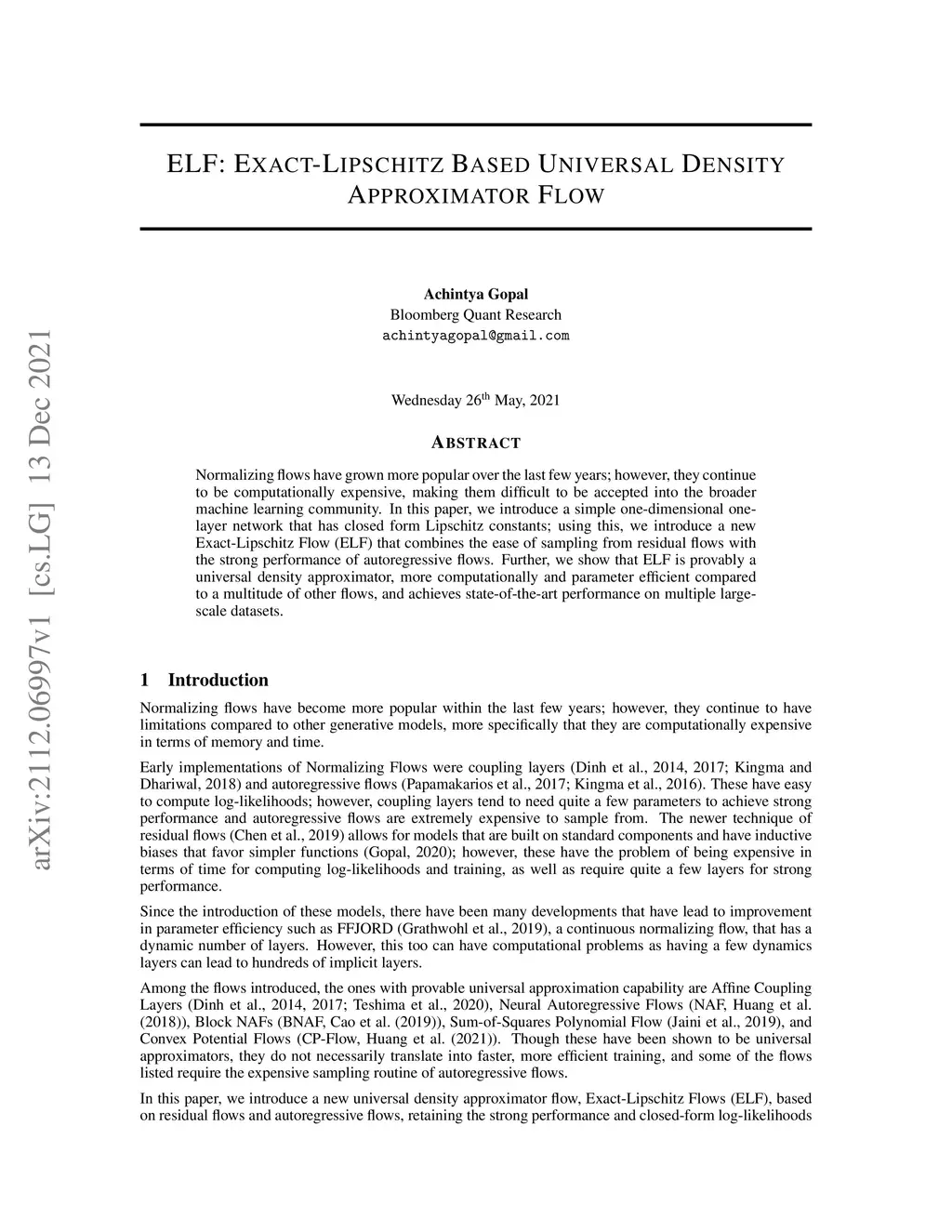 ELF: Exact-Lipschitz Based Universal Density Approximator Flow