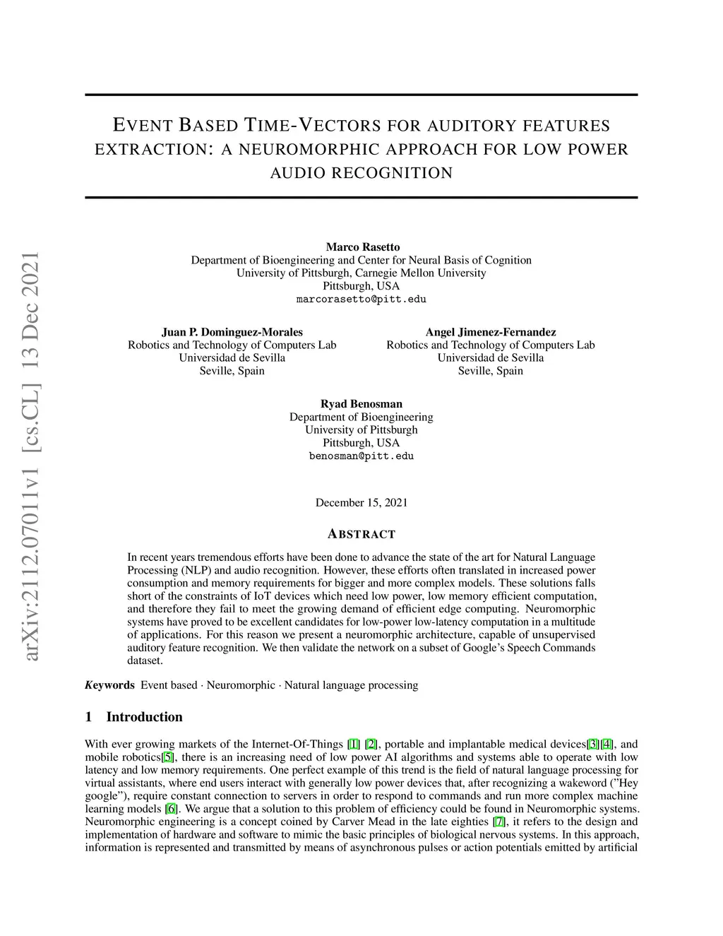 In recent years tremendous efforts have been done to advance the state of the art for Natural Language Processing (NLP) and audio recognition. However, these efforts often translated in increased power consumption and memory requirements for bigger and more complex models. These solutions falls short of the constraints of IoT devices which need low power, low memory efficient computation, and therefore they fail to meet the growing demand of efficient edge computing. Neuromorphic systems have proved to be excellent candidates for low-power low-latency computation in a multitude of applications. For this reason we present a neuromorphic architecture, capable of unsupervised auditory feature recognition. We then validate the network on a subset of Google's Speech Commands dataset.