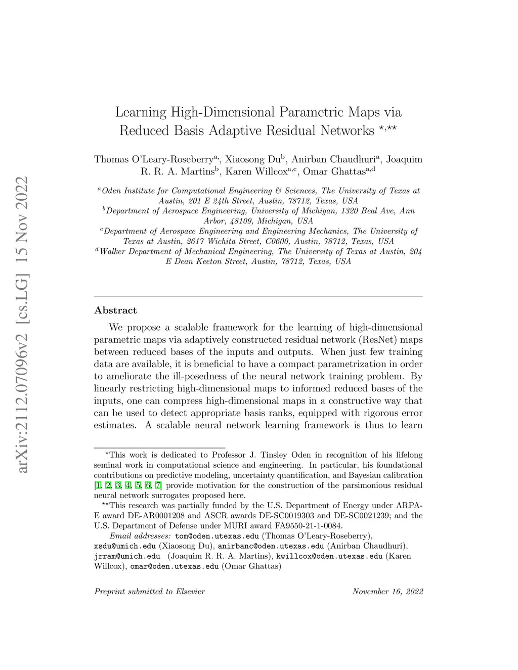 We propose a scalable framework for the learning of high-dimensional parametric maps via adaptively constructed residual network (ResNet) maps between reduced bases of the inputs and outputs. When just few training data are available, it is beneficial to have a compact parametrization in order to ameliorate the ill-posedness of the neural network training problem. By linearly restricting high-dimensional maps to informed reduced bases of the inputs, one can compress high-dimensional maps in a constructive way that can be used to detect appropriate basis ranks, equipped with rigorous error estimates. A scalable neural network learning framework is thus to learn the nonlinear compressed reduced basis mapping. Unlike the reduced basis construction, however, neural network constructions are not guaranteed to reduce errors by adding representation power, making it difficult to achieve good practical performance. Inspired by recent approximation theory that connects ResNets to sequential minimizing flows, we present an adaptive ResNet construction algorithm. This algorithm allows for depth-wise enrichment of the neural network approximation, in a manner that can achieve good practical performance by first training a shallow network and then adapting. We prove universal approximation of the associated neural network class for functions on compact sets. Our overall framework allows for constructive means to detect appropriate breadth and depth, and related compact parametrizations of neural networks, significantly reducing the need for architectural hyperparameter tuning. Numerical experiments for parametric PDE problems and a 3D CFD wing design optimization parametric map demonstrate that the proposed methodology can achieve remarkably high accuracy for limited training data, and outperformed other neural network strategies we compared against.