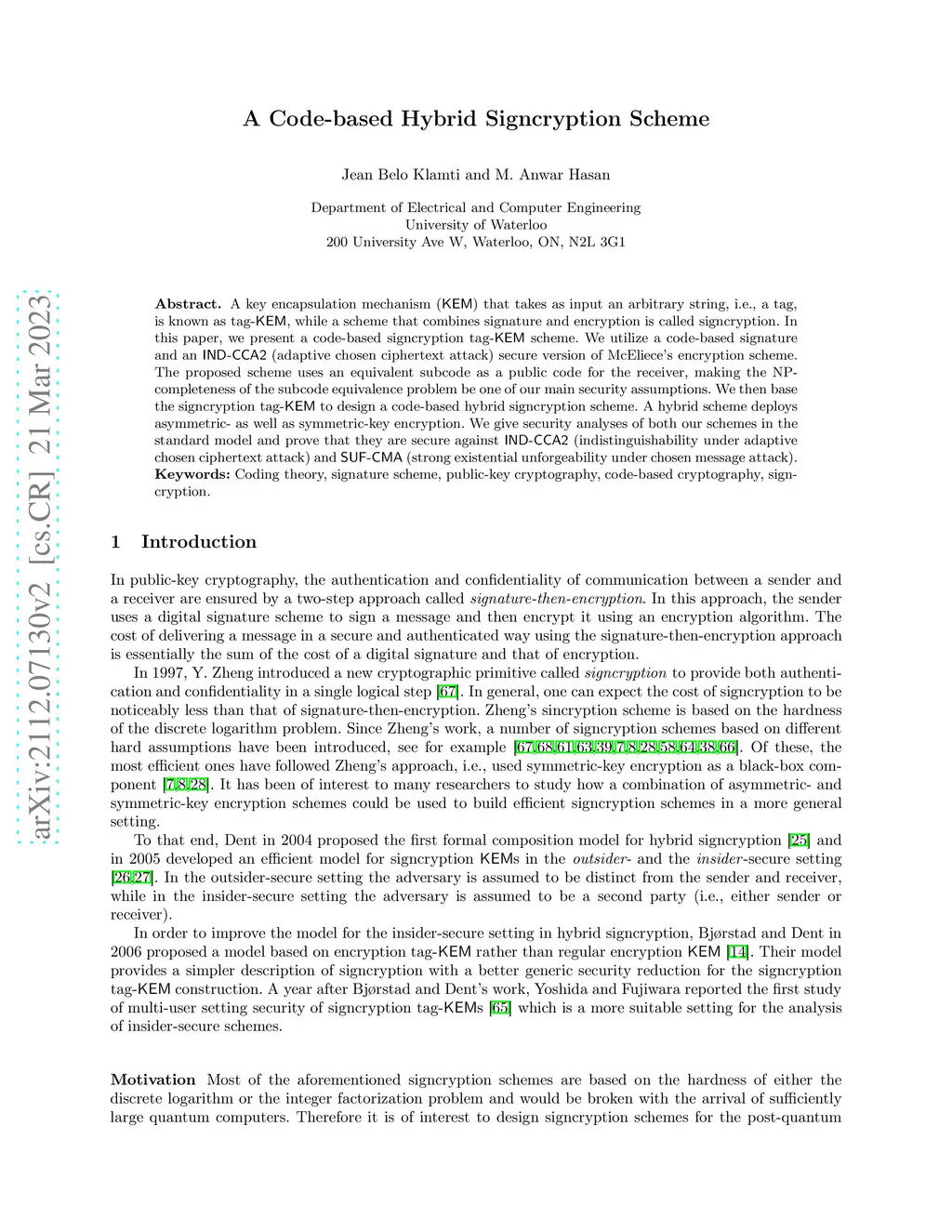 A key encapsulation mechanism (KEM) that takes as input an arbitrary string, i.e., a tag, is known as tag-KEM, while a scheme that combines signature and encryption is called signcryption. In this paper, we present a code-based signcryption tag-KEM scheme. We utilize a code-based signature and a CCA2 (adaptive chosen ciphertext attack) secure version of McEliece's {encryption} scheme. The proposed scheme uses an equivalent subcode as a public code for the receiver, making the NP-completeness of the equivalent subcode problem be one of our main security assumptions. We then base the signcryption tag-KEM to design a code-based hybrid signcryption scheme. A hybrid scheme deploys an asymmetric- as well as a symmetric-key encryption. We give security analyses of both our schemes in the standard model and prove that they are secure against IND-CCA2 (indistinguishability under adaptive chosen ciphertext attack) and SUF-CMA (strong existential unforgeability under chosen message attack).