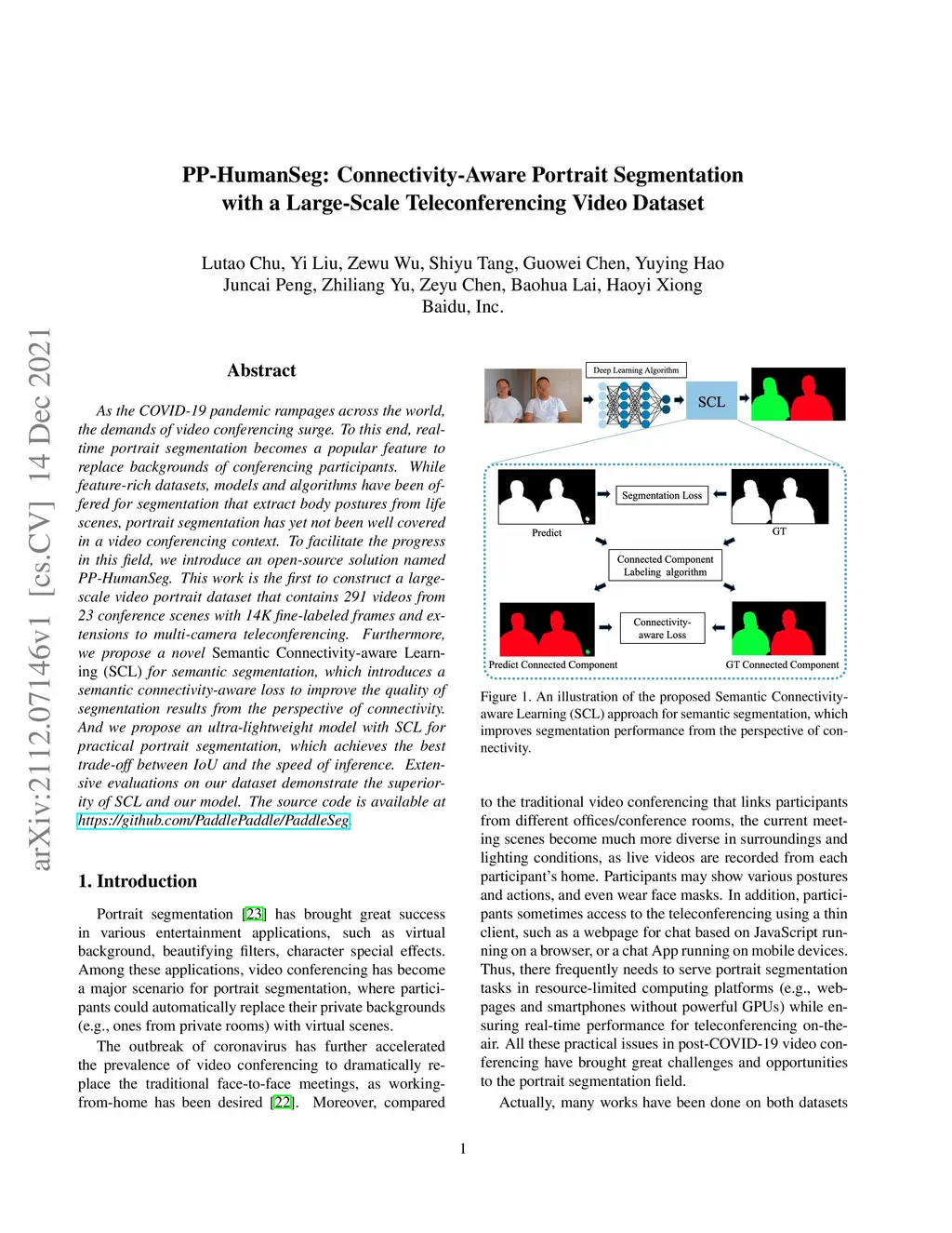 As the COVID-19 pandemic rampages across the world, the demands of video conferencing surge. To this end, real-time portrait segmentation becomes a popular feature to replace backgrounds of conferencing participants. While feature-rich datasets, models and algorithms have been offered for segmentation that extract body postures from life scenes, portrait segmentation has yet not been well covered in a video conferencing context. To facilitate the progress in this field, we introduce an open-source solution named PP-HumanSeg. This work is the first to construct a large-scale video portrait dataset that contains 291 videos from 23 conference scenes with 14K fine-labeled frames and extensions to multi-camera teleconferencing. Furthermore, we propose a novel Semantic Connectivity-aware Learning (SCL) for semantic segmentation, which introduces a semantic connectivity-aware loss to improve the quality of segmentation results from the perspective of connectivity. And we propose an ultra-lightweight model with SCL for practical portrait segmentation, which achieves the best trade-off between IoU and the speed of inference. Extensive evaluations on our dataset demonstrate the superiority of SCL and our model. The source code is available at https://github.com/PaddlePaddle/PaddleSeg.