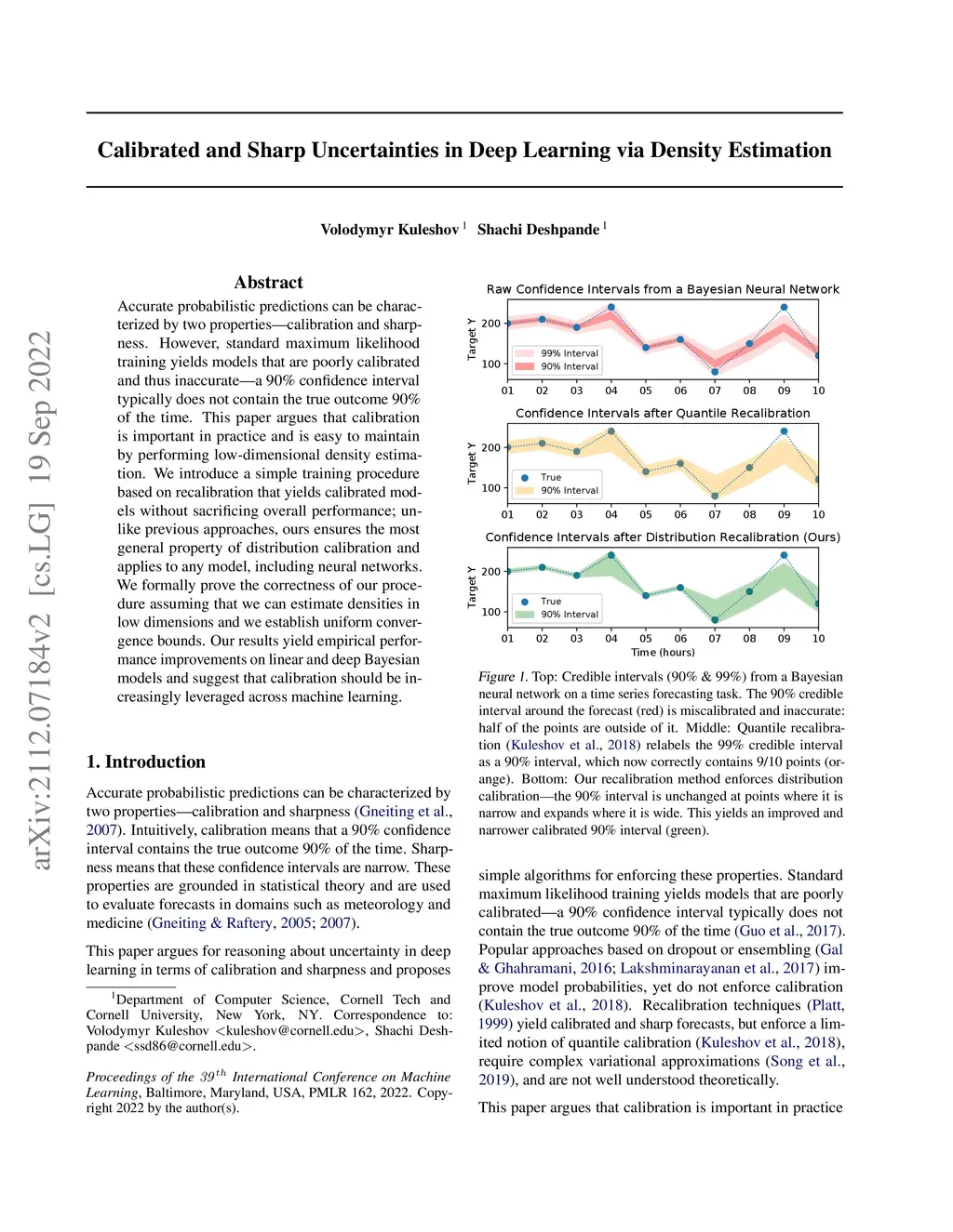 Accurate probabilistic predictions can be characterized by two properties -- calibration and sharpness. However, standard maximum likelihood training yields models that are poorly calibrated and thus inaccurate -- a 90% confidence interval typically does not contain the true outcome 90% of the time. This paper argues that calibration is important in practice and is easy to maintain by performing low-dimensional density estimation. We introduce a simple training procedure based on recalibration that yields calibrated models without sacrificing overall performance; unlike previous approaches, ours ensures the most general property of distribution calibration and applies to any model, including neural networks. We formally prove the correctness of our procedure assuming that we can estimate densities in low dimensions and we establish uniform convergence bounds. Our results yield empirical performance improvements on linear and deep Bayesian models and suggest that calibration should be increasingly leveraged across machine learning. We release a library that implements our methods along with a blog post here:this https URL.