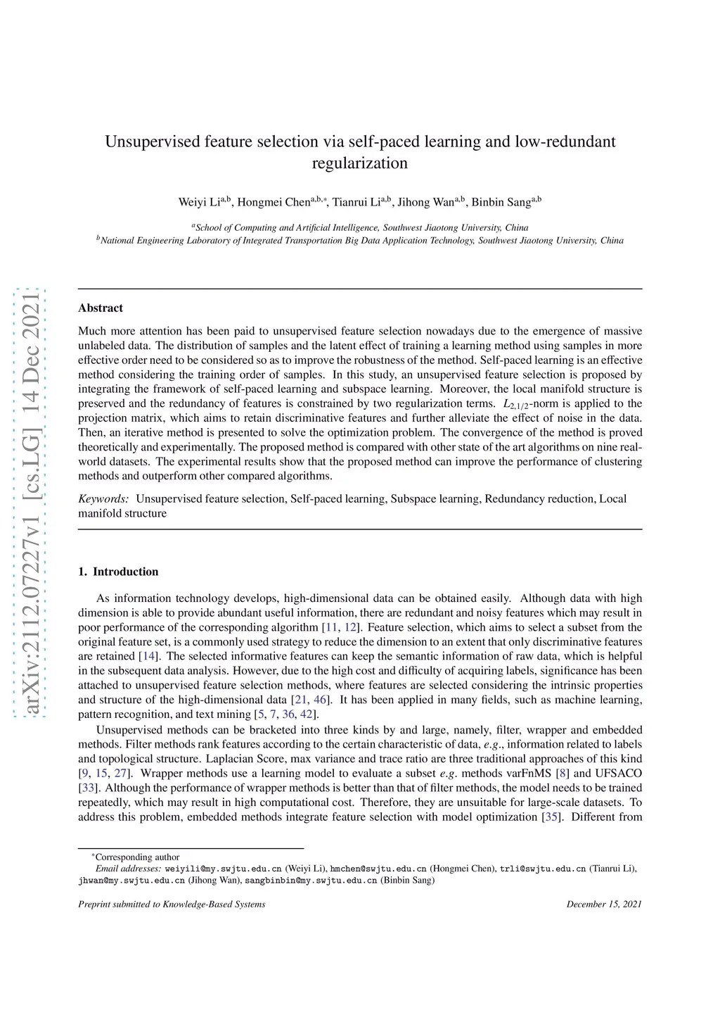 Much more attention has been paid to unsupervised feature selection nowadays due to the emergence of massive unlabeled data. The distribution of samples and the latent effect of training a learning method using samples in more effective order need to be considered so as to improve the robustness of the method. Self-paced learning is an effective method considering the training order of samples. In this study, an unsupervised feature selection is proposed by integrating the framework of self-paced learning and subspace learning. Moreover, the local manifold structure is preserved and the redundancy of features is constrained by two regularization terms. -norm is applied to the projection matrix, which aims to retain discriminative features and further alleviate the effect of noise in the data. Then, an iterative method is presented to solve the optimization problem. The convergence of the method is proved theoretically and experimentally. The proposed method is compared with other state of the art algorithms on nine real-world datasets. The experimental results show that the proposed method can improve the performance of clustering methods and outperform other compared algorithms.
