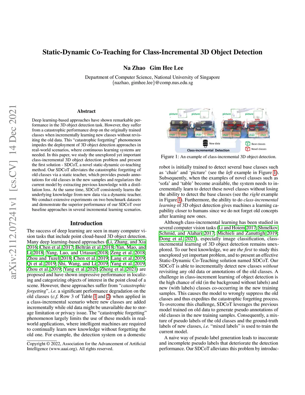 Deep learning-based approaches have shown remarkable performance in the 3D object detection task. However, they suffer from a catastrophic performance drop on the originally trained classes when incrementally learning new classes without revisiting the old data. This "catastrophic forgetting" phenomenon impedes the deployment of 3D object detection approaches in real-world scenarios, where continuous learning systems are needed. In this paper, we study the unexplored yet important class-incremental 3D object detection problem and present the first solution - SDCoT, a novel static-dynamic co-teaching method. Our SDCoT alleviates the catastrophic forgetting of old classes via a static teacher, which provides pseudo annotations for old classes in the new samples and regularizes the current model by extracting previous knowledge with a distillation loss. At the same time, SDCoT consistently learns the underlying knowledge from new data via a dynamic teacher. We conduct extensive experiments on two benchmark datasets and demonstrate the superior performance of our SDCoT over baseline approaches in several incremental learning scenarios.