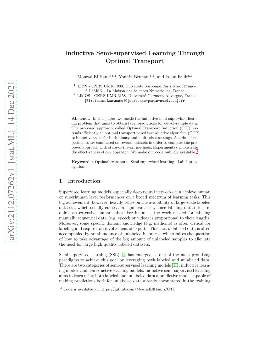 In this paper, we tackle the inductive semi-supervised learning problem that aims to obtain label predictions for out-of-sample data. The proposed approach, called Optimal Transport Induction (OTI), extends efficiently an optimal transport based transductive algorithm (OTP) to inductive tasks for both binary and multi-class settings. A series of experiments are conducted on several datasets in order to compare the proposed approach with state-of-the-art methods. Experiments demonstrate the effectiveness of our approach. We make our code publicly available (Code is available at: https://github.com/MouradElHamri/OTI).