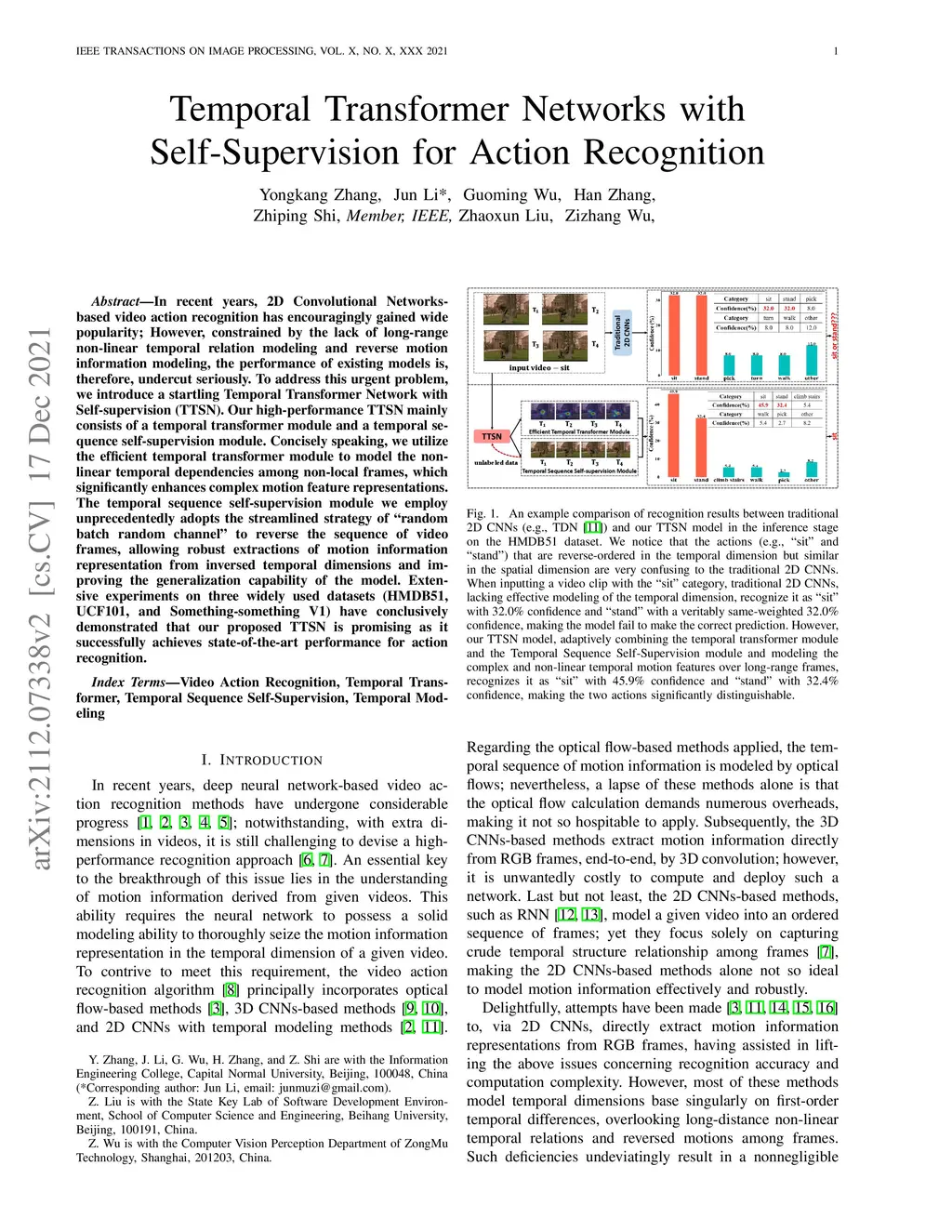 In recent years, 2D Convolutional Networks-based video action recognition has encouragingly gained wide popularity; However, constrained by the lack of long-range non-linear temporal relation modeling and reverse motion information modeling, the performance of existing models is, therefore, undercut seriously. To address this urgent problem, we introduce a startling Temporal Transformer Network with Self-supervision (TTSN). Our high-performance TTSN mainly consists of a temporal transformer module and a temporal sequence self-supervision module. Concisely speaking, we utilize the efficient temporal transformer module to model the non-linear temporal dependencies among non-local frames, which significantly enhances complex motion feature representations. The temporal sequence self-supervision module we employ unprecedentedly adopts the streamlined strategy of "random batch random channel" to reverse the sequence of video frames, allowing robust extractions of motion information representation from inversed temporal dimensions and improving the generalization capability of the model. Extensive experiments on three widely used datasets (HMDB51, UCF101, and Something-something V1) have conclusively demonstrated that our proposed TTSN is promising as it successfully achieves state-of-the-art performance for action recognition.
