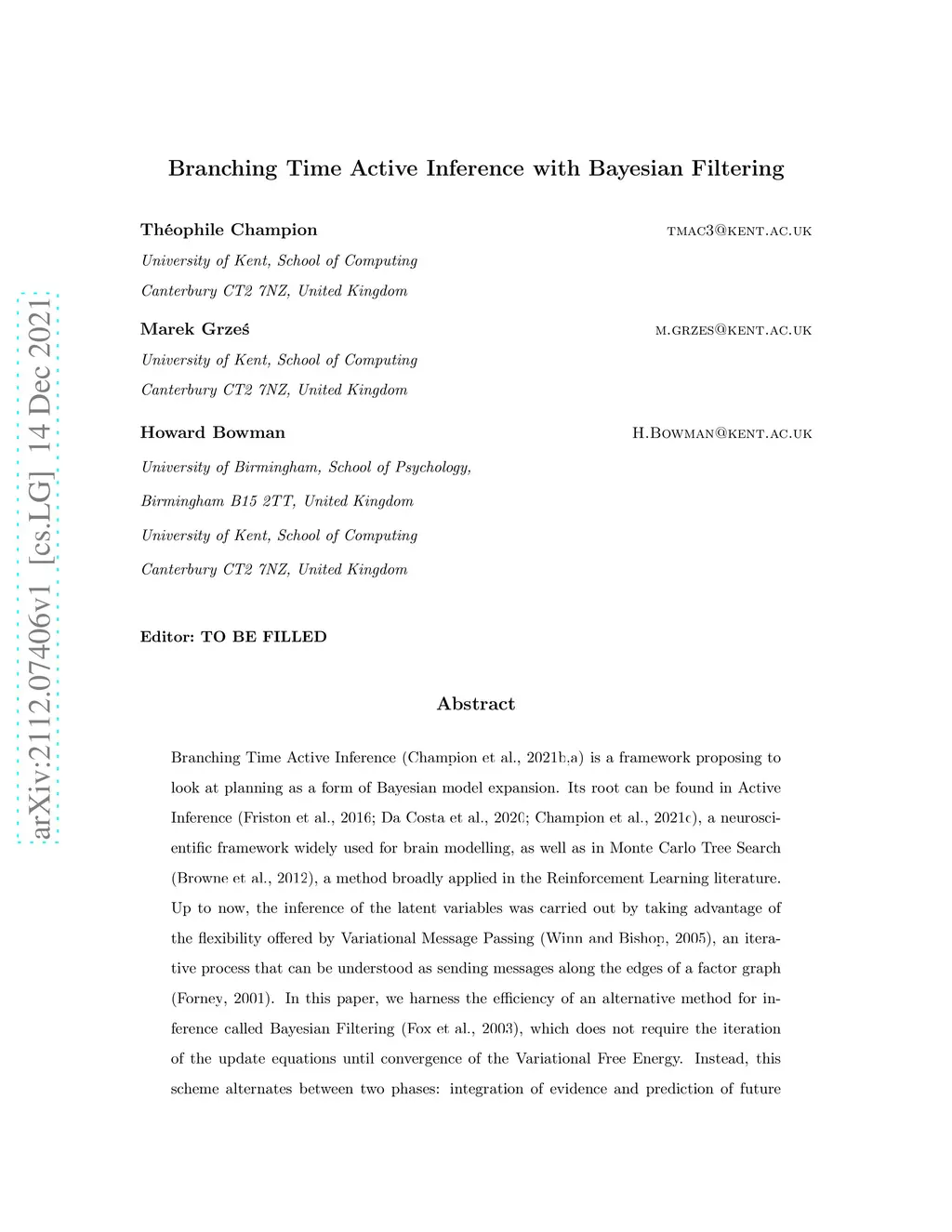Branching Time Active Inference with Bayesian Filtering