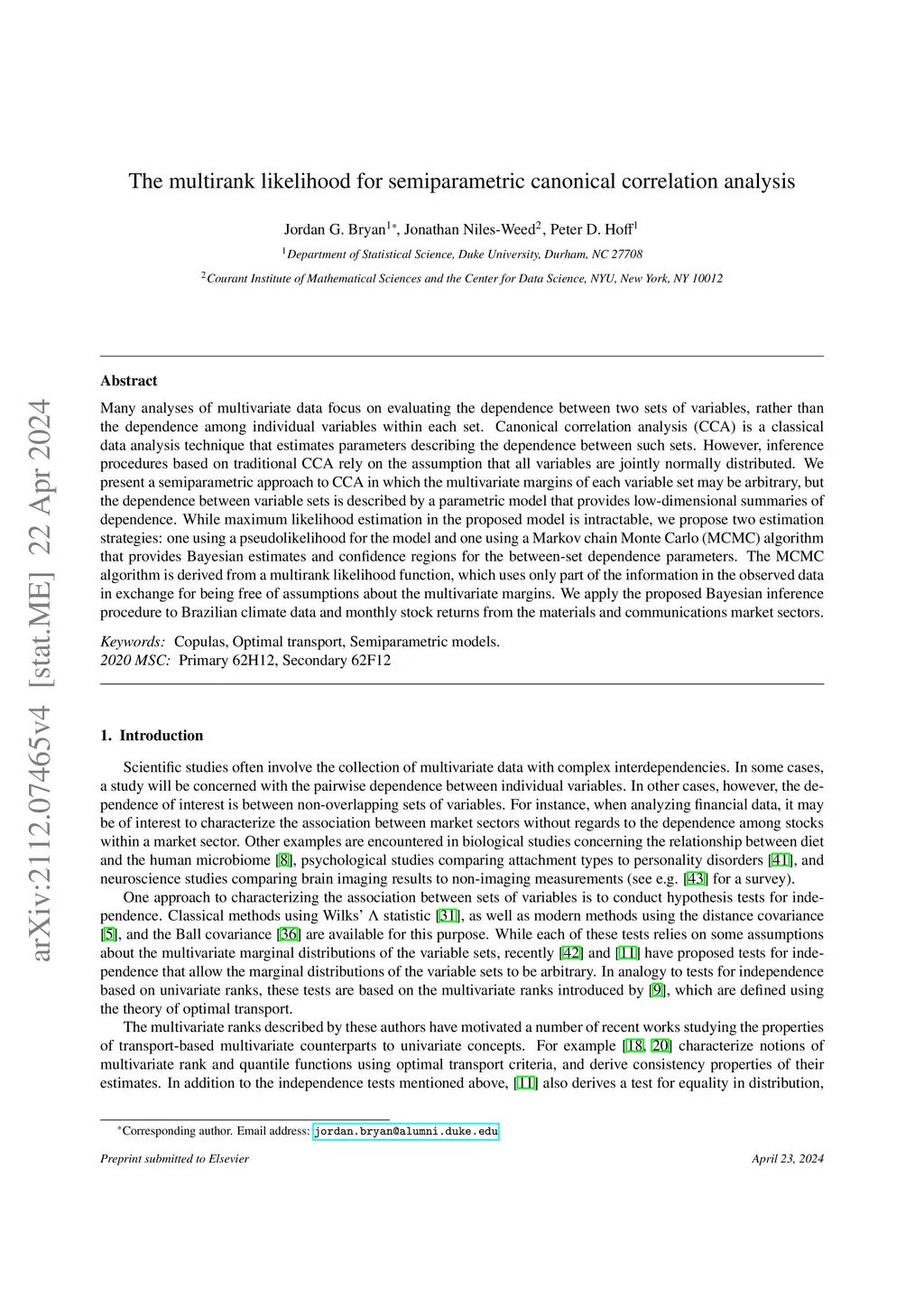 Many analyses of multivariate data focus on evaluating the dependence between two sets of variables, rather than the dependence among individual variables within each set. Canonical correlation analysis (CCA) is a classical data analysis technique that estimates parameters describing the dependence between such sets. However, inference procedures based on traditional CCA rely on the assumption that all variables are jointly normally distributed. We present a semiparametric approach to CCA in which the multivariate margins of each variable set may be arbitrary, but the dependence between variable sets is described by a parametric model that provides low-dimensional summaries of dependence. While maximum likelihood estimation in the proposed model is intractable, we propose two estimation strategies: one using a pseudolikelihood for the model and one using a Markov chain Monte Carlo (MCMC) algorithm that provides Bayesian estimates and confidence regions for the between-set dependence parameters. The MCMC algorithm is derived from a multirank likelihood function, which uses only part of the information in the observed data in exchange for being free of assumptions about the multivariate margins. We apply the proposed Bayesian inference procedure to Brazilian climate data and monthly stock returns from the materials and communications market sectors.