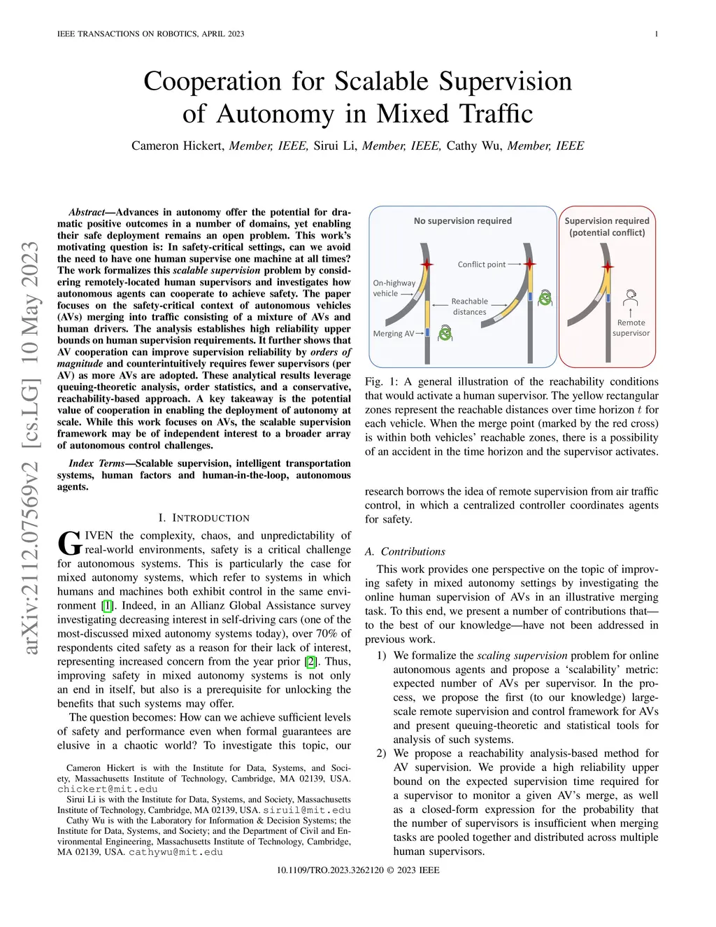 Advances in autonomy offer the potential for dramatic positive outcomes in a number of domains, yet enabling their safe deployment remains an open problem. This work's motivating question is: In safety-critical settings, can we avoid the need to have one human supervise one machine at all times? The work formalizes this scalable supervision problem by considering remotely located human supervisors and investigating how autonomous agents can cooperate to achieve safety. This article focuses on the safety-critical context of autonomous vehicles (AVs) merging into traffic consisting of a mixture of AVs and human drivers. The analysis establishes high reliability upper bounds on human supervision requirements. It further shows that AV cooperation can improve supervision reliability by orders of magnitude and counterintuitively requires fewer supervisors (per AV) as more AVs are adopted. These analytical results leverage queuing-theoretic analysis, order statistics, and a conservative, reachability-based approach. A key takeaway is the potential value of cooperation in enabling the deployment of autonomy at scale. While this work focuses on AVs, the scalable supervision framework may be of independent interest to a broader array of autonomous control challenges.
