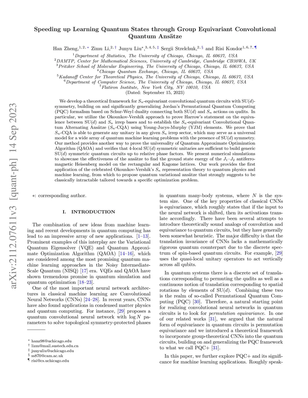We develop a theoretical framework for -equivariant convolutional quantum circuits with SU-symmetry, building on and significantly generalizing Jordan's Permutational Quantum Computing (PQC) formalism based on Schur-Weyl duality connecting both SU and actions on qudits. In particular, we utilize the Okounkov-Vershik approach to prove Harrow's statement (Ph.D. Thesis 2005 p.160) on the equivalence between and irrep bases and to establish the -equivariant Convolutional Quantum Alternating Ans\"atze (-CQA) using Young-Jucys-Murphy (YJM) elements. We prove that -CQA is able to generate any unitary in any given irrep sector, which may serve as a universal model for a wide array of quantum machine learning problems with the presence of SU() symmetry. Our method provides another way to prove the universality of Quantum Approximate Optimization Algorithm (QAOA) and verifies that 4-local SU() symmetric unitaries are sufficient to build generic SU() symmetric quantum circuits up to relative phase factors. We present numerical simulations to showcase the effectiveness of the ans\"atze to find the ground state energy of the -- antiferromagnetic Heisenberg model on the rectangular and Kagome lattices. Our work provides the first application of the celebrated Okounkov-Vershik's representation theory to quantum physics and machine learning, from which to propose quantum variational ans\"atze that strongly suggests to be classically intractable tailored towards a specific optimization problem.