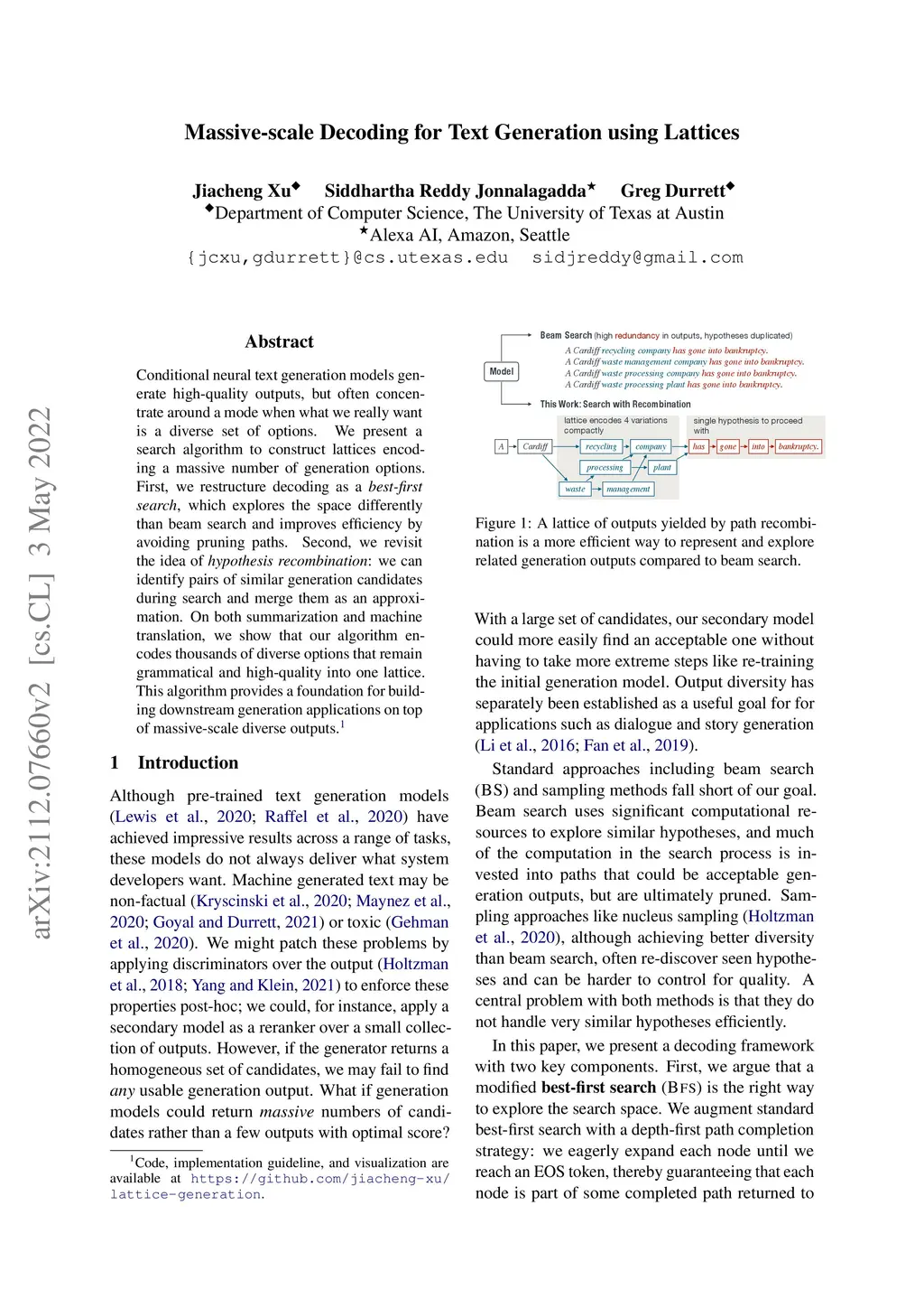 Neural text generation models like those used for summarization and translation generate high-quality outputs, but often concentrate around a mode when what we really want is a diverse set of options. We present a search algorithm to construct lattices encoding a massive number of generation options. First, we restructure decoding as a best-first search, which explores the space differently than beam search and improves efficiency by avoiding pruning paths. Second, we revisit the idea of hypothesis recombination: we can identify pairs of similar generation candidates during search and merge them as an approximation. On both document summarization and machine translation, we show that our algorithm encodes hundreds to thousands of diverse options that remain grammatical and high-quality into one linear-sized lattice. This algorithm provides a foundation for building downstream generation applications on top of massive-scale diverse outputs.