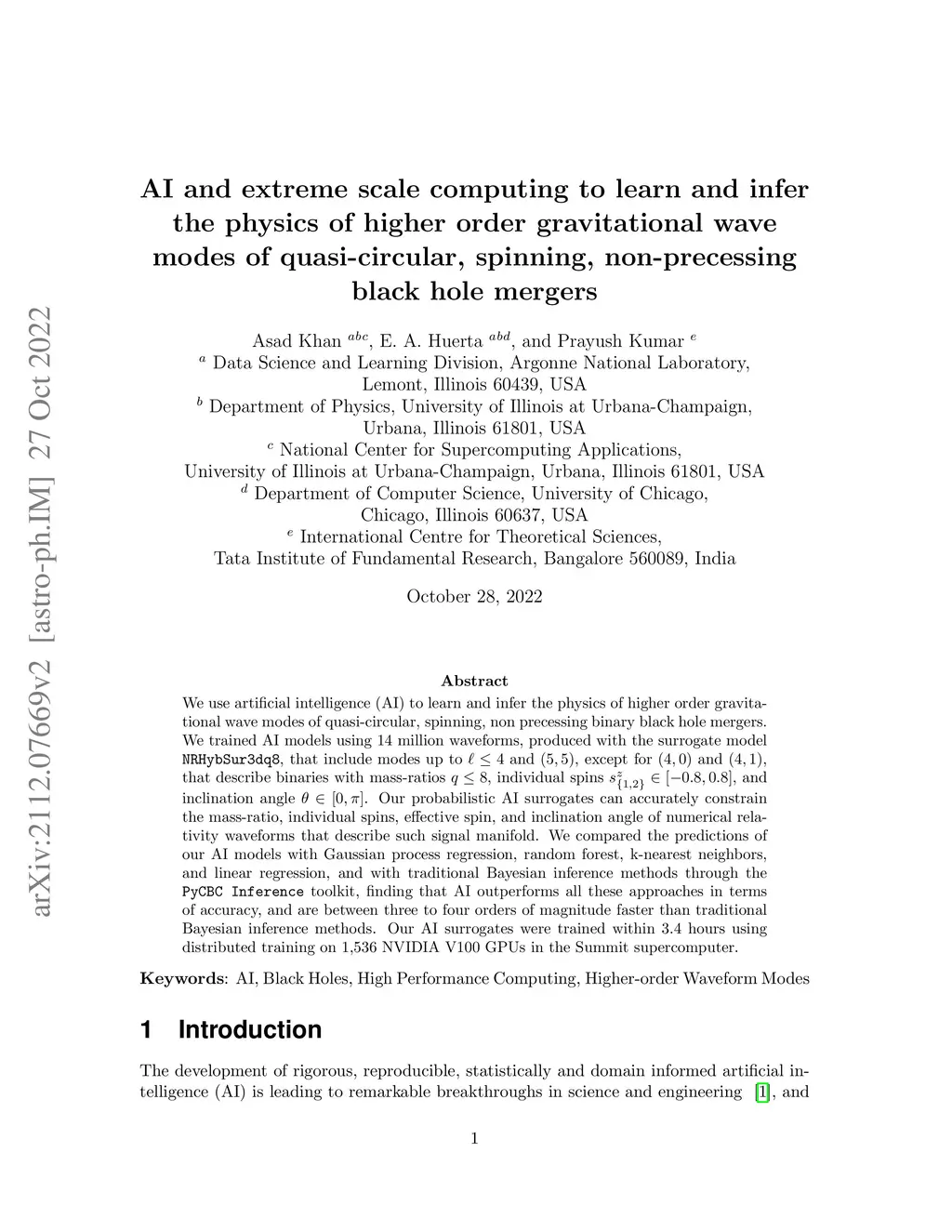 We use artificial intelligence (AI) to learn and infer the physics of higher order gravitational wave modes of quasi-circular, spinning, non precessing binary black hole mergers. We trained AI models using 14 million waveforms, produced with the surrogate model NRHybSur3dq8, that include modes up to and , except for and , that describe binaries with mass-ratios , individual spins , and inclination angle .Our probabilistic AI surrogates can accurately constrain the mass-ratio, individual spins, effective spin, and inclination angle of numerical relativity waveforms that describe such signal manifold. We compared the predictions of our AI models with Gaussian process regression, random forest, k-nearest neighbors, and linear regression, and with traditional Bayesian inference methods through the PyCBC Inference toolkit, finding that AI outperforms all these approaches in terms of accuracy, and are between three to four orders of magnitude faster than traditional Bayesian inference methods. Our AI surrogates were trained within 3.4 hours using distributed training on 1,536 NVIDIA V100 GPUs in the Summit supercomputer.
