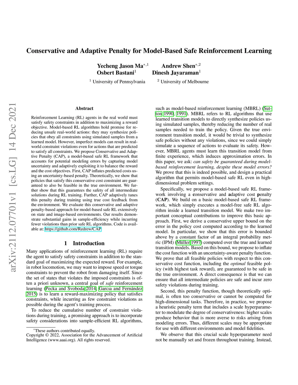 Reinforcement Learning (RL) agents in the real world must satisfy safety constraints in addition to maximizing a reward objective. Model-based RL algorithms hold promise for reducing unsafe real-world actions: they may synthesize policies that obey all constraints using simulated samples from a learned model. However, imperfect models can result in real-world constraint violations even for actions that are predicted to satisfy all constraints. We propose Conservative and Adaptive Penalty (CAP), a model-based safe RL framework that accounts for potential modeling errors by capturing model uncertainty and adaptively exploiting it to balance the reward and the cost objectives. First, CAP inflates predicted costs using an uncertainty-based penalty. Theoretically, we show that policies that satisfy this conservative cost constraint are guaranteed to also be feasible in the true environment. We further show that this guarantees the safety of all intermediate solutions during RL training. Further, CAP adaptively tunes this penalty during training using true cost feedback from the environment. We evaluate this conservative and adaptive penalty-based approach for model-based safe RL extensively on state and image-based environments. Our results demonstrate substantial gains in sample-efficiency while incurring fewer violations than prior safe RL algorithms. Code is available at: https://github.com/Redrew/CAP