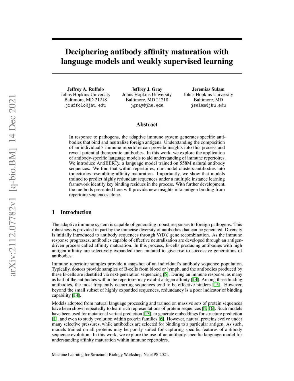 In response to pathogens, the adaptive immune system generates specific antibodies that bind and neutralize foreign antigens. Understanding the composition of an individual's immune repertoire can provide insights into this process and reveal potential therapeutic antibodies. In this work, we explore the application of antibody-specific language models to aid understanding of immune repertoires. We introduce AntiBERTy, a language model trained on 558M natural antibody sequences. We find that within repertoires, our model clusters antibodies into trajectories resembling affinity maturation. Importantly, we show that models trained to predict highly redundant sequences under a multiple instance learning framework identify key binding residues in the process. With further development, the methods presented here will provide new insights into antigen binding from repertoire sequences alone.