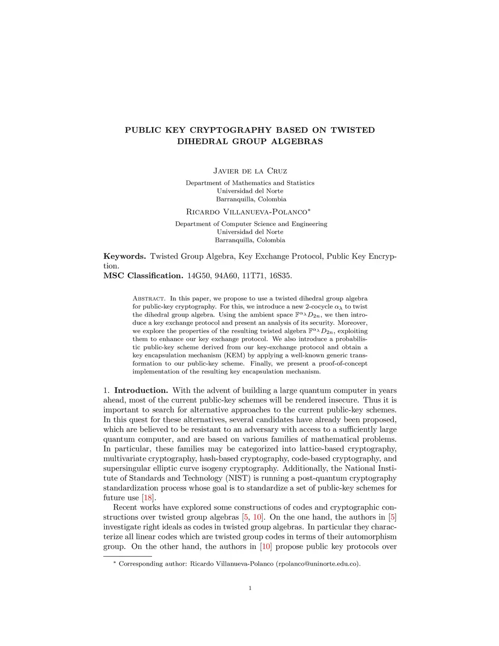In this paper, we propose to use a twisted dihedral group algebra for public-key cryptography. For this, we introduce a new -cocycle to twist the dihedral group algebra. Using the ambient space , we then introduce a key exchange protocol and present an analysis of its security. Moreover, we explore the properties of the resulting twisted algebra , exploiting them to enhance our key exchange protocol. We also introduce a probabilistic public-key scheme derived from our key-exchange protocol and obtain a key encapsulation mechanism (KEM) by applying a well-known generic transformation to our public-key scheme. Finally, we present a proof-of-concept implementation of the resulting key encapsulation mechanism.