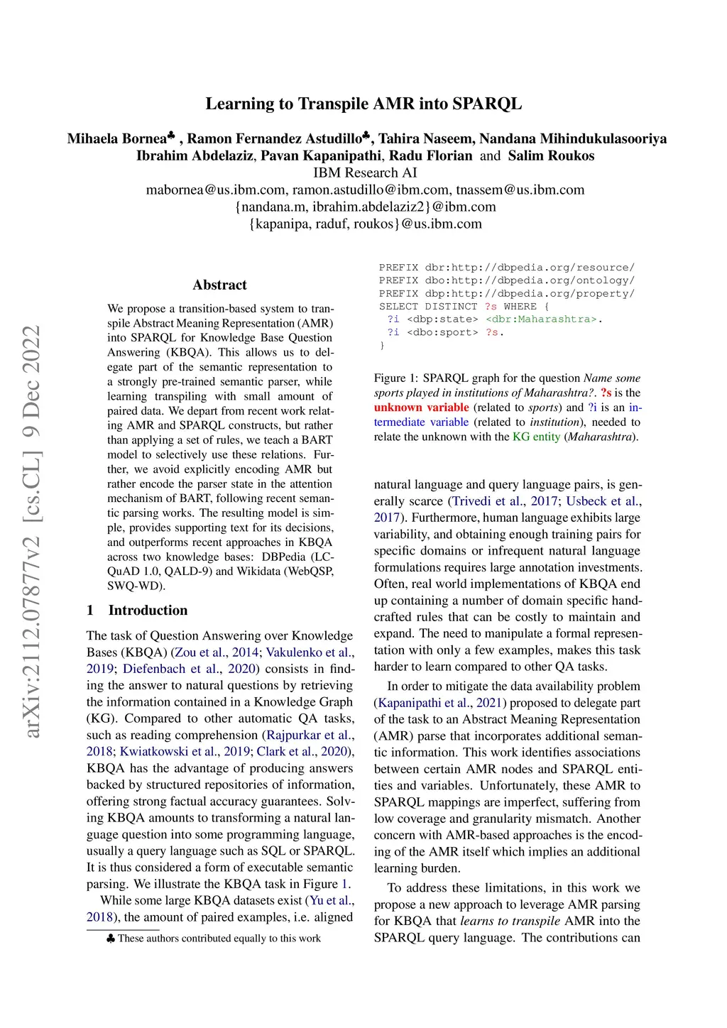 We propose a transition-based system to transpile Abstract Meaning Representation (AMR) into SPARQL for Knowledge Base Question Answering (KBQA). This allows us to delegate part of the semantic representation to a strongly pre-trained semantic parser, while learning transpiling with small amount of paired data. We depart from recent work relating AMR and SPARQL constructs, but rather than applying a set of rules, we teach a BART model to selectively use these relations. Further, we avoid explicitly encoding AMR but rather encode the parser state in the attention mechanism of BART, following recent semantic parsing works. The resulting model is simple, provides supporting text for its decisions, and outperforms recent approaches in KBQA across two knowledge bases: DBPedia (LC-QuAD 1.0, QALD-9) and Wikidata (WebQSP, SWQ-WD).
