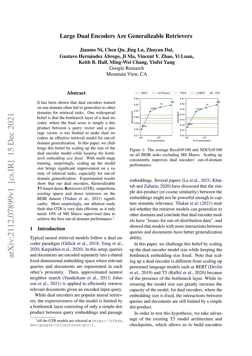 Large Dual Encoders Are Generalizable Retrievers