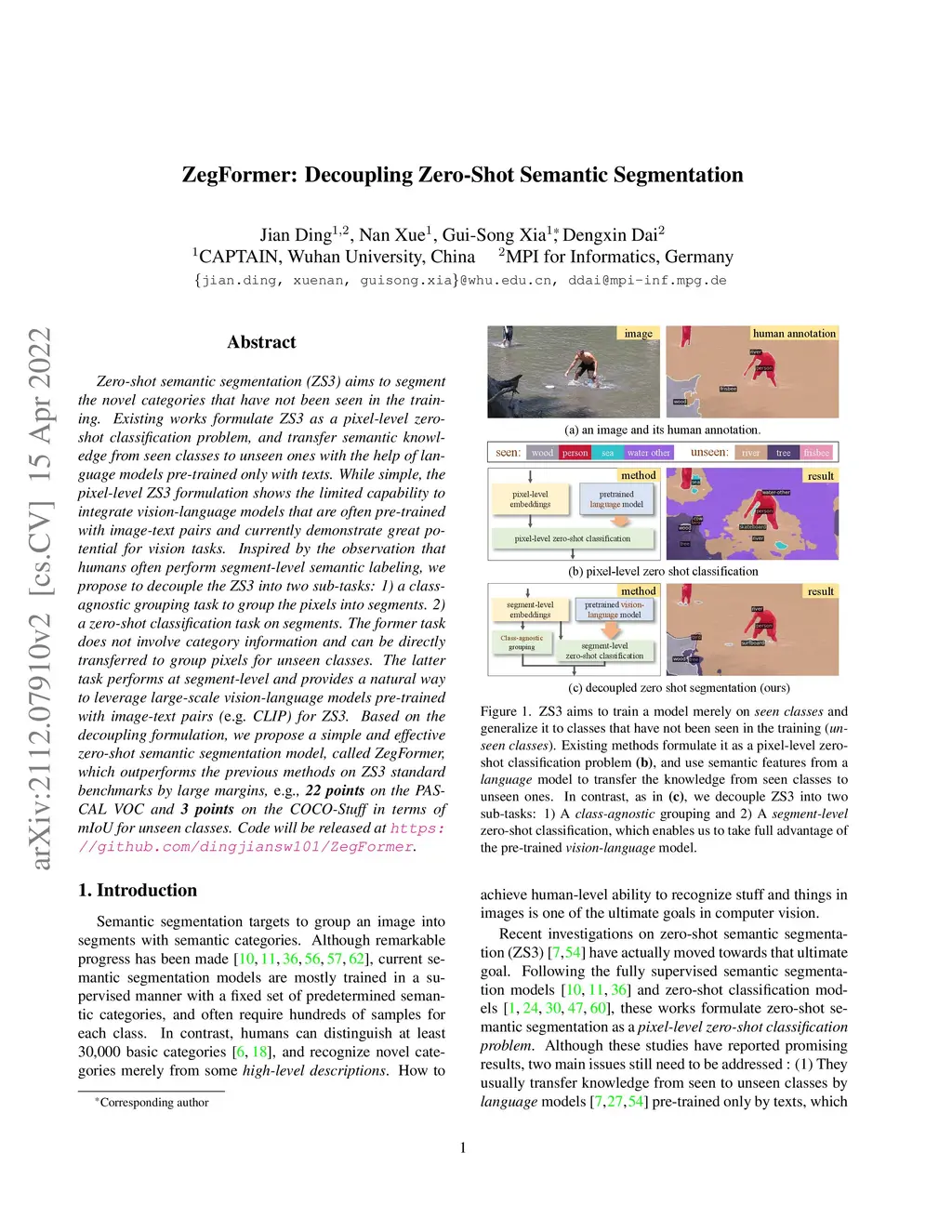 Zero-shot semantic segmentation (ZS3) aims to segment the novel categories that have not been seen in the training. Existing works formulate ZS3 as a pixel-level zeroshot classification problem, and transfer semantic knowledge from seen classes to unseen ones with the help of language models pre-trained only with texts. While simple, the pixel-level ZS3 formulation shows the limited capability to integrate vision-language models that are often pre-trained with image-text pairs and currently demonstrate great potential for vision tasks. Inspired by the observation that humans often perform segment-level semantic labeling, we propose to decouple the ZS3 into two sub-tasks: 1) a classagnostic grouping task to group the pixels into segments. 2) a zero-shot classification task on segments. The former task does not involve category information and can be directly transferred to group pixels for unseen classes. The latter task performs at segment-level and provides a natural way to leverage large-scale vision-language models pre-trained with image-text pairs (e.g. CLIP) for ZS3. Based on the decoupling formulation, we propose a simple and effective zero-shot semantic segmentation model, called ZegFormer, which outperforms the previous methods on ZS3 standard benchmarks by large margins, e.g., 22 points on the PASCAL VOC and 3 points on the COCO-Stuff in terms of mIoU for unseen classes. Code will be released at https://github.com/dingjiansw101/ZegFormer.