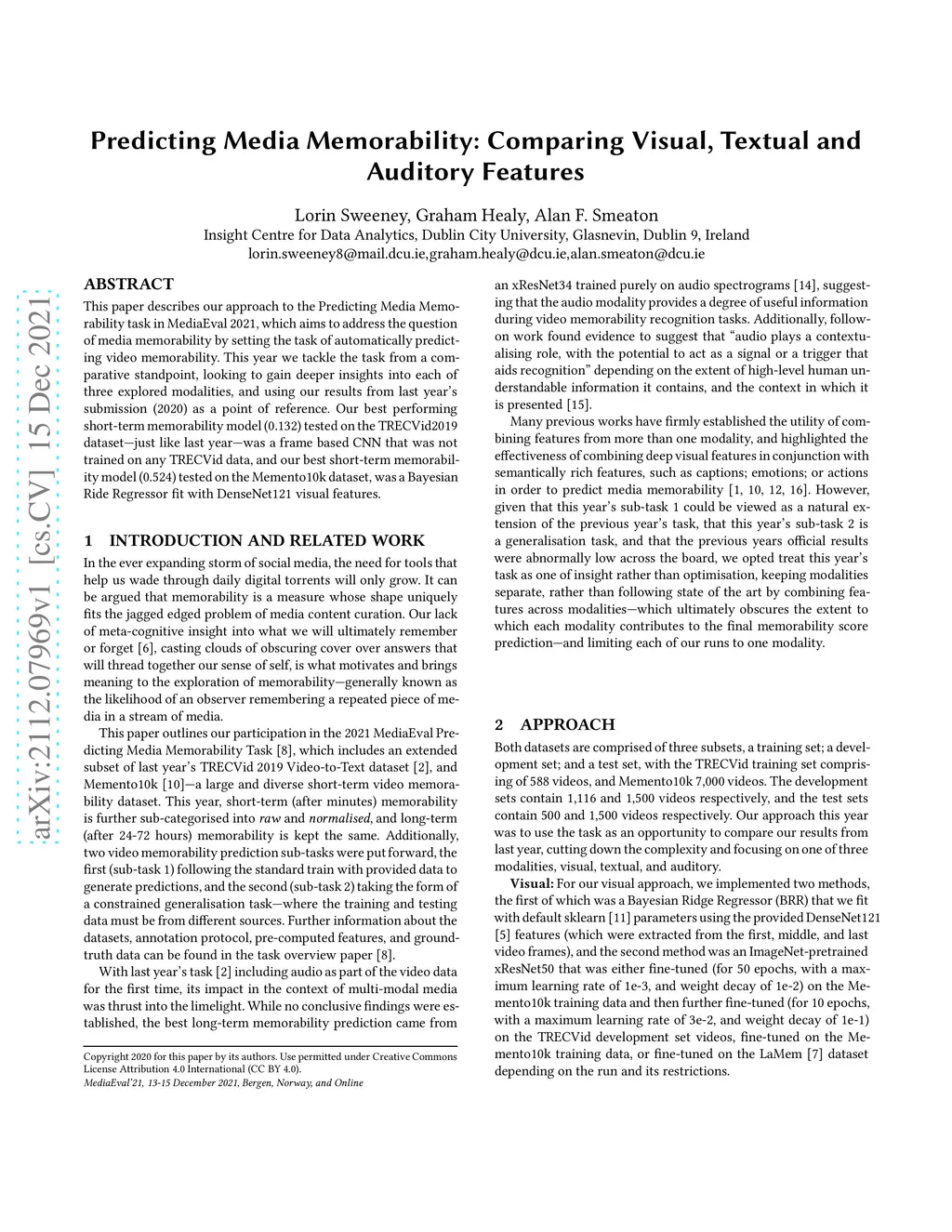 This paper describes our approach to the Predicting Media Memorability task in MediaEval 2021, which aims to address the question of media memorability by setting the task of automatically predicting video memorability. This year we tackle the task from a comparative standpoint, looking to gain deeper insights into each of three explored modalities, and using our results from last year's submission (2020) as a point of reference. Our best performing short-term memorability model (0.132) tested on the TRECVid2019 dataset -- just like last year -- was a frame based CNN that was not trained on any TRECVid data, and our best short-term memorability model (0.524) tested on the Memento10k dataset, was a Bayesian Ride Regressor fit with DenseNet121 visual features.