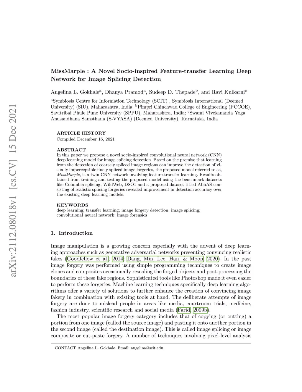 In this paper we propose a novel socio-inspired convolutional neural network (CNN) deep learning model for image splicing detection. Based on the premise that learning from the detection of coarsely spliced image regions can improve the detection of visually imperceptible finely spliced image forgeries, the proposed model referred to as, MissMarple, is a twin CNN network involving feature-transfer learning. Results obtained from training and testing the proposed model using the benchmark datasets like Columbia splicing, WildWeb, DSO1 and a proposed dataset titled AbhAS consisting of realistic splicing forgeries revealed improvement in detection accuracy over the existing deep learning models.