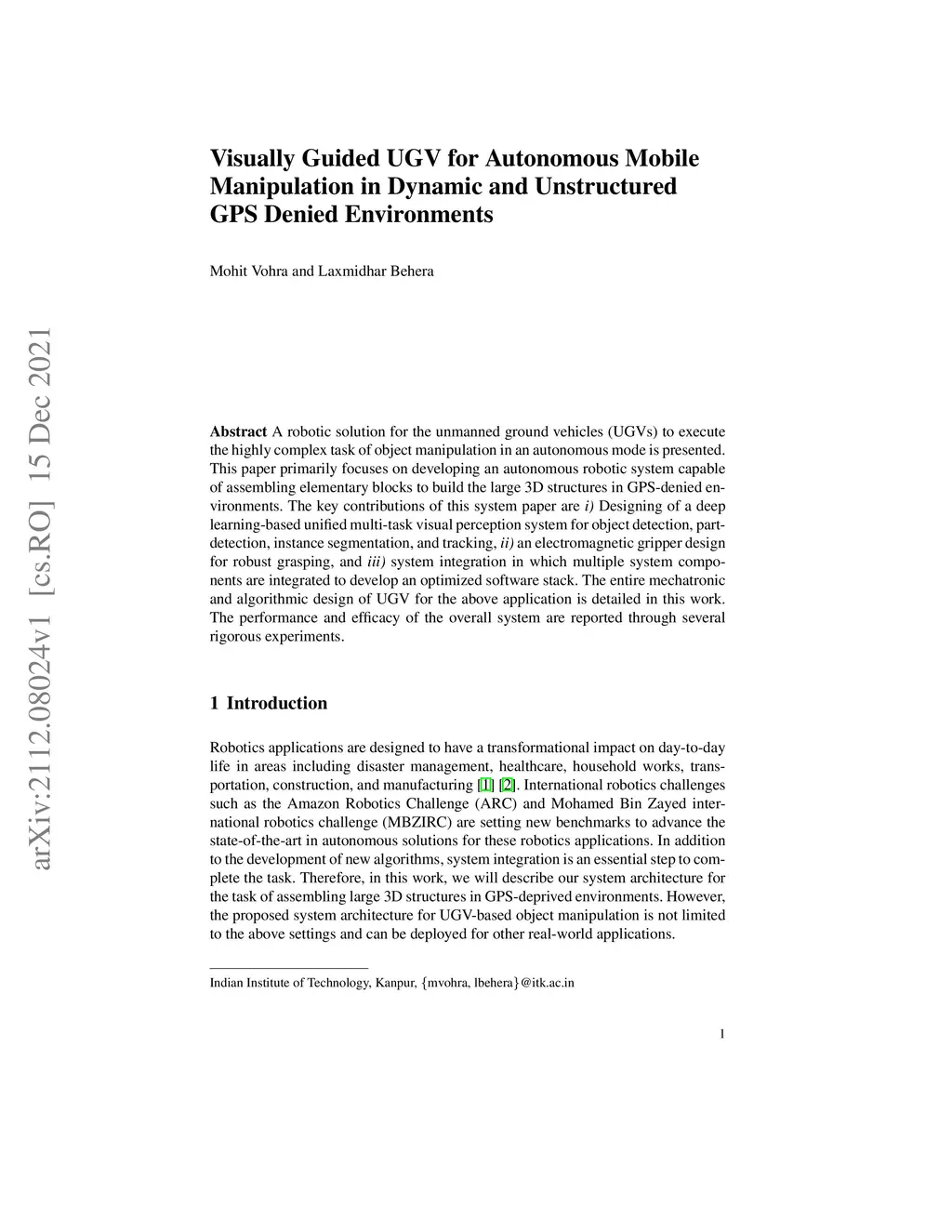 A robotic solution for the unmanned ground vehicles (UGVs) to execute the highly complex task of object manipulation in an autonomous mode is presented. This paper primarily focuses on developing an autonomous robotic system capable of assembling elementary blocks to build the large 3D structures in GPS-denied environments. The key contributions of this system paper are i) Designing of a deep learning-based unified multi-task visual perception system for object detection, part-detection, instance segmentation, and tracking, ii) an electromagnetic gripper design for robust grasping, and iii) system integration in which multiple system components are integrated to develop an optimized software stack. The entire mechatronic and algorithmic design of UGV for the above application is detailed in this work. The performance and efficacy of the overall system are reported through several rigorous experiments.