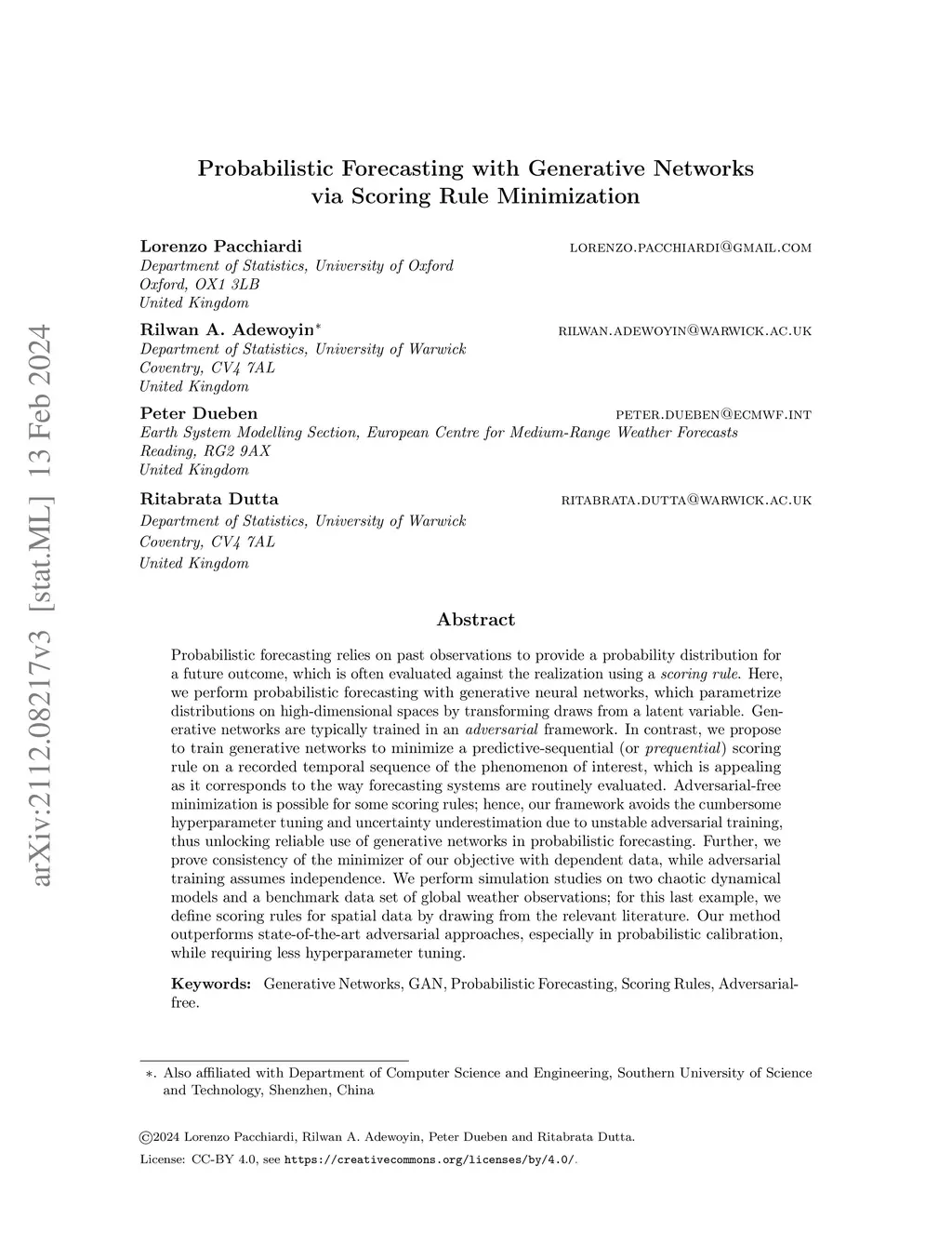 Generative networks are often trained to minimize a statistical divergence between the reference distribution and the generative one in an adversarial setting. Some works trained instead generative networks to minimize Scoring Rules, functions assessing how well the generative distribution matches each training sample individually. We show how the Scoring Rule formulation easily extends to the so-called prequential (predictive-sequential) score, whose minimization allows performing probabilistic forecasting with generative networks. This objective leads to adversarial-free training, therefore easily avoiding uncertainty underestimation due to mode collapse, which is a common issue in the adversarial setting and undesirable for probabilistic forecasting. We provide consistency guarantees for the minimizer of the prequential score and employ that to perform probabilistic forecasting for two chaotic dynamical models and a benchmark dataset of global weather observations. For this last example, we define scoring rules for spatial data by drawing from the relevant literature, with which we obtain better uncertainty quantification with little hyperparameter tuning compared to adversarial training.