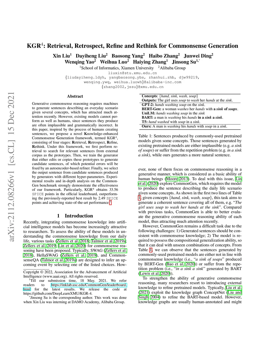 Generative commonsense reasoning requires machines to generate sentences describing an everyday scenario given several concepts, which has attracted much attention recently. However, existing models cannot perform as well as humans, since sentences they produce are often implausible and grammatically incorrect. In this paper, inspired by the process of humans creating sentences, we propose a novel Knowledge-enhanced Commonsense Generation framework, termed KGR^4, consisting of four stages: Retrieval, Retrospect, Refine, Rethink. Under this framework, we first perform retrieval to search for relevant sentences from external corpus as the prototypes. Then, we train the generator that either edits or copies these prototypes to generate candidate sentences, of which potential errors will be fixed by an autoencoder-based refiner. Finally, we select the output sentence from candidate sentences produced by generators with different hyper-parameters. Experimental results and in-depth analysis on the CommonGen benchmark strongly demonstrate the effectiveness of our framework. Particularly, KGR^4 obtains 33.56 SPICE points in the official leaderboard, outperforming the previously-reported best result by 2.49 SPICE points and achieving state-of-the-art performance.