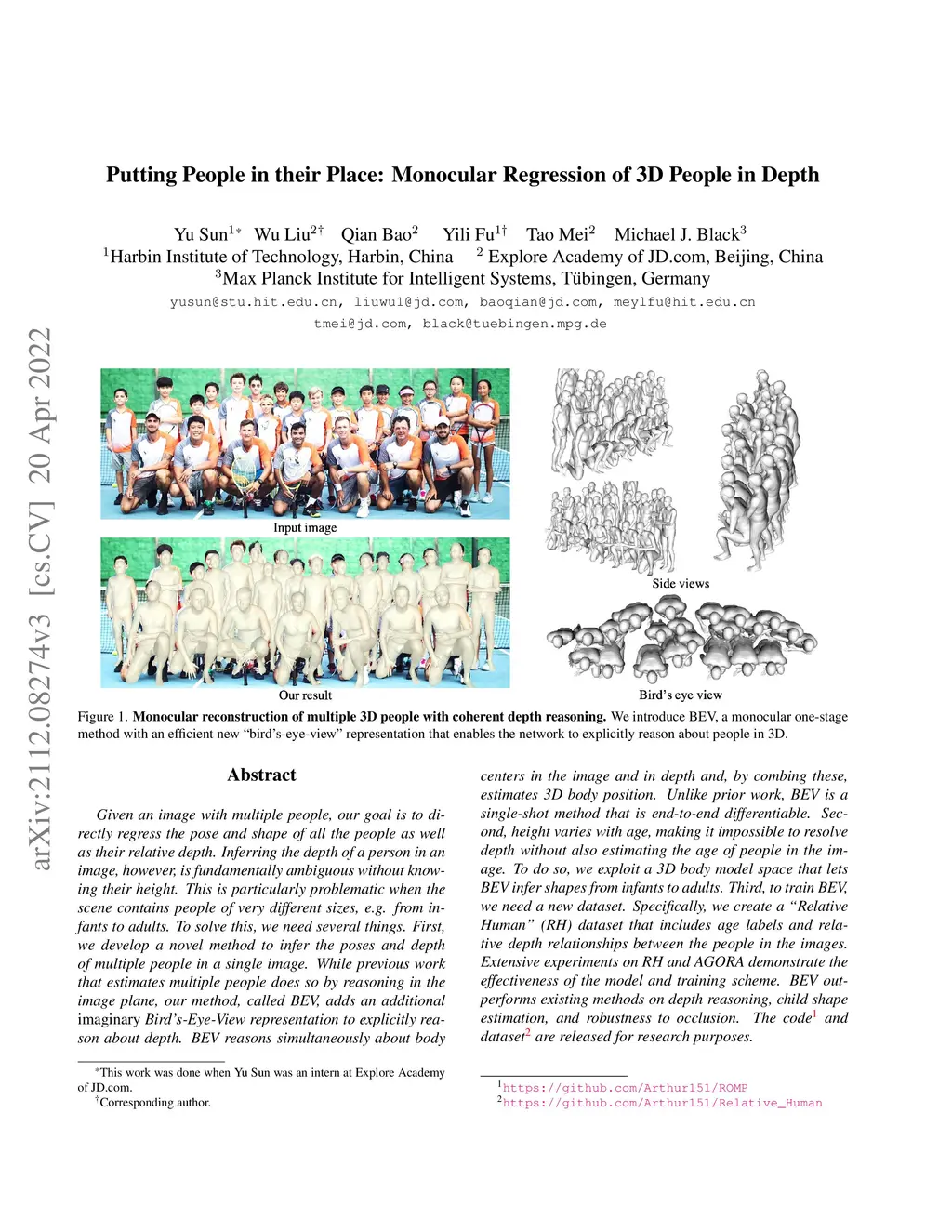 Given an image with multiple people, our goal is to directly regress the pose and shape of all the people as well as their relative depth. Inferring the depth of a person in an image, however, is fundamentally ambiguous without knowing their height. This is particularly problematic when the scene contains people of very different sizes, e.g. from infants to adults. To solve this, we need several things. First, we develop a novel method to infer the poses and depth of multiple people in a single image. While previous work that estimates multiple people does so by reasoning in the image plane, our method, called BEV, adds an additional imaginary Bird's-Eye-View representation to explicitly reason about depth. BEV reasons simultaneously about body centers in the image and in depth and, by combing these, estimates 3D body position. Unlike prior work, BEV is a single-shot method that is end-to-end differentiable. Second, height varies with age, making it impossible to resolve depth without also estimating the age of people in the image. To do so, we exploit a 3D body model space that lets BEV infer shapes from infants to adults. Third, to train BEV, we need a new dataset. Specifically, we create a "Relative Human" (RH) dataset that includes age labels and relative depth relationships between the people in the images. Extensive experiments on RH and AGORA demonstrate the effectiveness of the model and training scheme. BEV outperforms existing methods on depth reasoning, child shape estimation, and robustness to occlusion. The code and dataset will be released for research purposes.