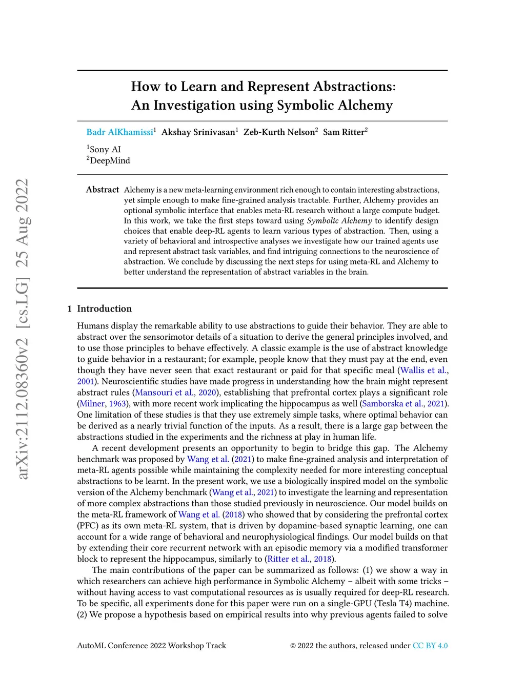 Alchemy is a new meta-learning environment rich enough to contain interesting abstractions, yet simple enough to make fine-grained analysis tractable. Further, Alchemy provides an optional symbolic interface that enables meta-RL research without a large compute budget. In this work, we take the first steps toward using Symbolic Alchemy to identify design choices that enable deep-RL agents to learn various types of abstraction. Then, using a variety of behavioral and introspective analyses we investigate how our trained agents use and represent abstract task variables, and find intriguing connections to the neuroscience of abstraction. We conclude by discussing the next steps for using meta-RL and Alchemy to better understand the representation of abstract variables in the brain.