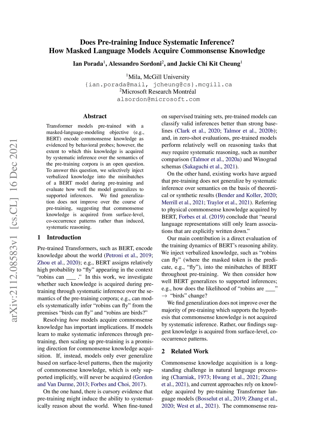 Transformer models pre-trained with a masked-language-modeling objective (e.g., BERT) encode commonsense knowledge as evidenced by behavioral probes; however, the extent to which this knowledge is acquired by systematic inference over the semantics of the pre-training corpora is an open question. To answer this question, we selectively inject verbalized knowledge into the minibatches of a BERT model during pre-training and evaluate how well the model generalizes to supported inferences. We find generalization does not improve over the course of pre-training, suggesting that commonsense knowledge is acquired from surface-level, co-occurrence patterns rather than induced, systematic reasoning.
