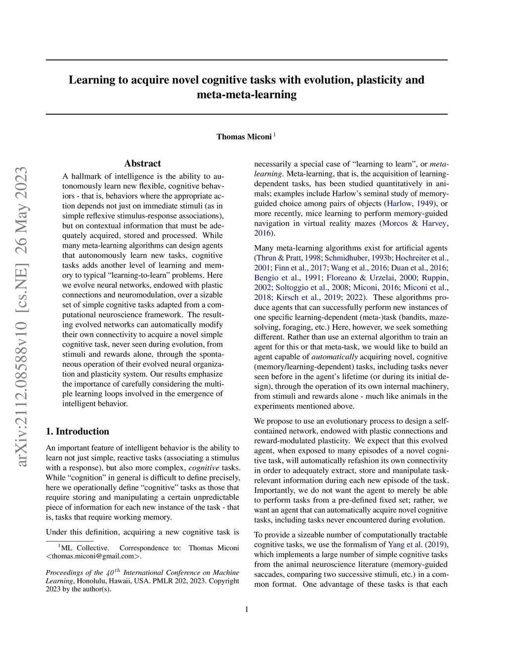 A hallmark of intelligence is the ability to autonomously learn new flexible, cognitive behaviors - that is, behaviors where the appropriate action depends not just on immediate stimuli (as in simple reflexive stimulus-response associations), but on contextual information that must be adequately acquired, stored and processed. While many meta-learning algorithms can design agents that autonomously learn new tasks, cognitive tasks adds another level of learning and memory to typical ``learning-to-learn'' problems. Here we evolve neural networks, endowed with plastic connections and neuromodulation, over a sizable set of simple cognitive tasks adapted from a computational neuroscience framework. The resulting evolved networks can automatically modify their own connectivity to acquire a novel simple cognitive task, never seen during evolution, from stimuli and rewards alone, through the spontaneous operation of their evolved neural organization and plasticity system. Our results emphasize the importance of carefully considering the multiple learning loops involved in the emergence of intelligent behavior.