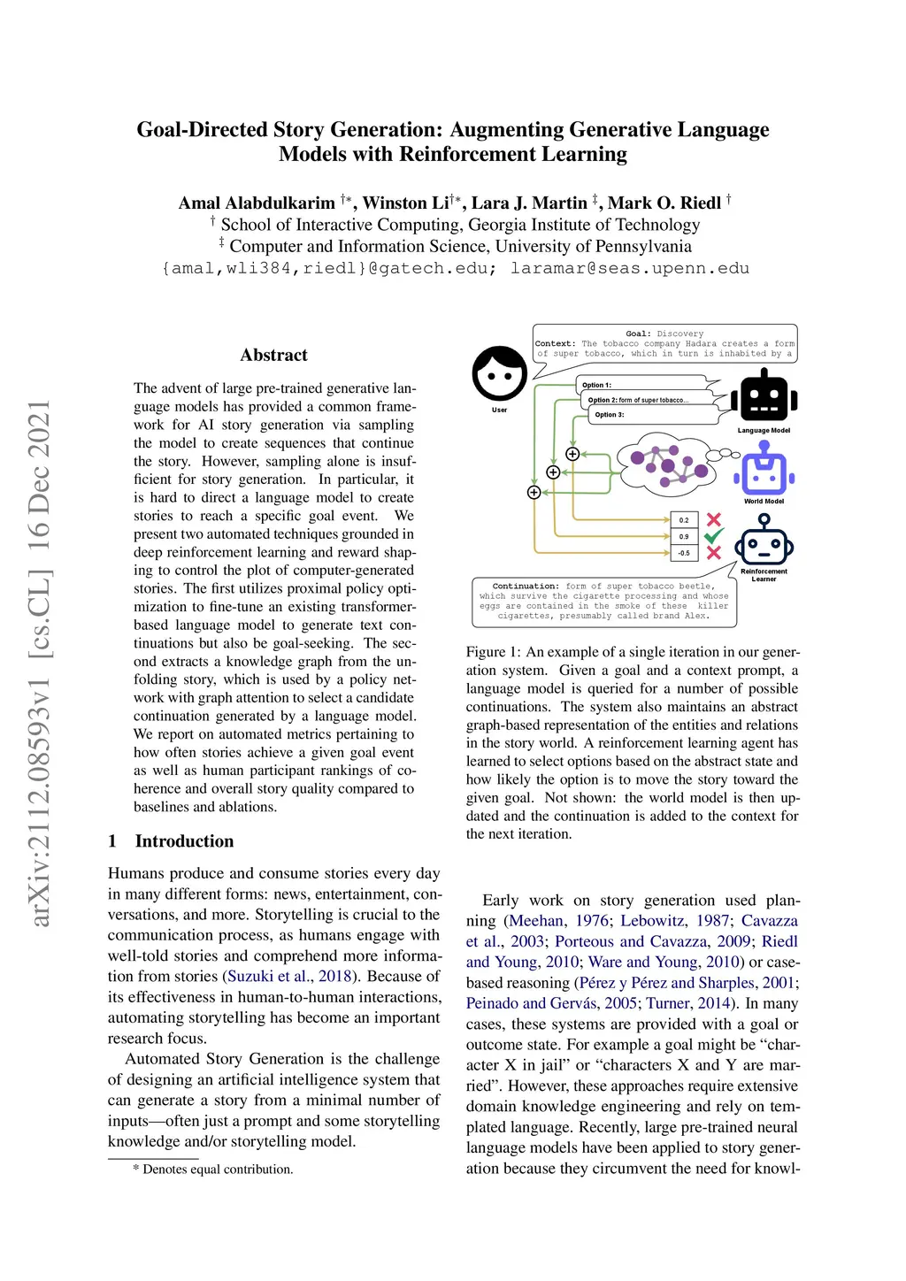 The advent of large pre-trained generative language models has provided a common framework for AI story generation via sampling the model to create sequences that continue the story. However, sampling alone is insufficient for story generation. In particular, it is hard to direct a language model to create stories to reach a specific goal event. We present two automated techniques grounded in deep reinforcement learning and reward shaping to control the plot of computer-generated stories. The first utilizes proximal policy optimization to fine-tune an existing transformer-based language model to generate text continuations but also be goal-seeking. The second extracts a knowledge graph from the unfolding story, which is used by a policy network with graph attention to select a candidate continuation generated by a language model. We report on automated metrics pertaining to how often stories achieve a given goal event as well as human participant rankings of coherence and overall story quality compared to baselines and ablations.