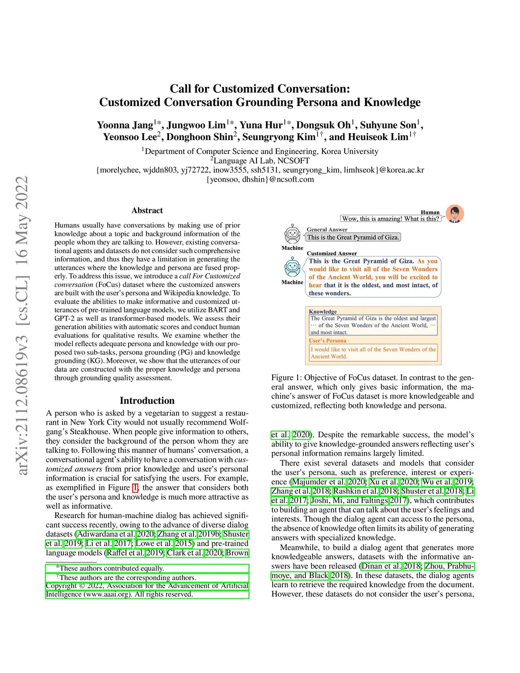 Humans usually have conversations by making use of prior knowledge about a topic and background information of the people whom they are talking to. However, existing conversational agents and datasets do not consider such comprehensive information, and thus they have a limitation in generating the utterances where the knowledge and persona are fused properly. To address this issue, we introduce a call For Customized conversation (FoCus) dataset where the customized answers are built with the user's persona and Wikipedia knowledge. To evaluate the abilities to make informative and customized utterances of pre-trained language models, we utilize BART and GPT-2 as well as transformer-based models. We assess their generation abilities with automatic scores and conduct human evaluations for qualitative results. We examine whether the model reflects adequate persona and knowledge with our proposed two sub-tasks, persona grounding (PG) and knowledge grounding (KG). Moreover, we show that the utterances of our data are constructed with the proper knowledge and persona through grounding quality assessment.