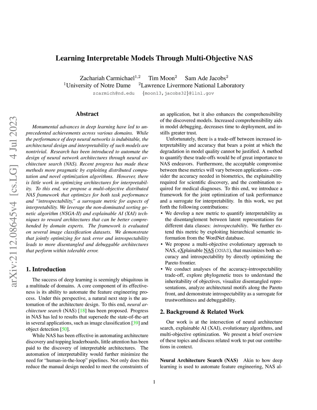 Monumental advances in deep learning have led to unprecedented achievements across various domains. While the performance of deep neural networks is indubitable, the architectural design and interpretability of such models are nontrivial. Research has been introduced to automate the design of neural network architectures through neural architecture search (NAS). Recent progress has made these methods more pragmatic by exploiting distributed computation and novel optimization algorithms. However, there is little work in optimizing architectures for interpretability. To this end, we propose a multi-objective distributed NAS framework that optimizes for both task performance and "introspectability," a surrogate metric for aspects of interpretability. We leverage the non-dominated sorting genetic algorithm (NSGA-II) and explainable AI (XAI) techniques to reward architectures that can be better comprehended by domain experts. The framework is evaluated on several image classification datasets. We demonstrate that jointly optimizing for task error and introspectability leads to more disentangled and debuggable architectures that perform within tolerable error.