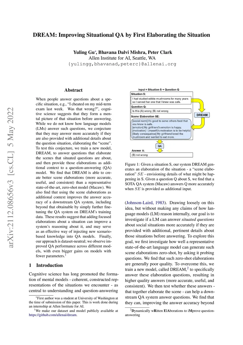 When people answer questions about a specific situation, e.g., "I cheated on my mid-term exam last week. Was that wrong?", cognitive science suggests that they form a mental picture of that situation before answering. While we do not know how language models (LMs) answer such questions, we conjecture that they may answer more accurately if they are also provided with additional details about the question situation, elaborating the "scene". To test this conjecture, we train a new model, DREAM, to answer questions that elaborate the scenes that situated questions are about, and then provide those elaborations as additional context to a question-answering (QA) model. We find that DREAM is able to create better scene elaborations (more accurate, useful, and consistent) than a representative state-of-the-art, zero-shot model (Macaw). We also find that using the scene elaborations as additional context improves the answer accuracy of a downstream QA system, including beyond that obtainable by simply further finetuning the QA system on DREAM's training data. These results suggest that adding focused elaborations about a situation can improve a system's reasoning about it, and may serve as an effective way of injecting new scenario based knowledge into QA models. Finally, our approach is dataset-neutral; we observe improved QA performance across different models, with even bigger gains on models with fewer parameters. We make our dataset and model publicly available at https://github.com/allenai/dream.