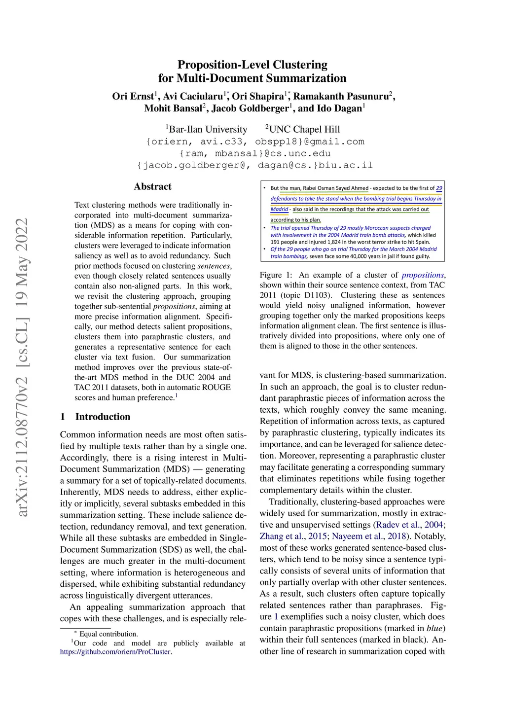 Text clustering methods were traditionally incorporated into multi-document summarization (MDS) as a means for coping with considerable information repetition. Particularly, clusters were leveraged to indicate information saliency as well as to avoid redundancy. Such prior methods focused on clustering sentences, even though closely related sentences usually contain also non-aligned parts. In this work, we revisit the clustering approach, grouping together sub-sentential propositions, aiming at more precise information alignment. Specifically, our method detects salient propositions, clusters them into paraphrastic clusters, and generates a representative sentence for each cluster via text fusion. Our summarization method improves over the previous state-of-the-art MDS method in the DUC 2004 and TAC 2011 datasets, both in automatic ROUGE scores and human preference.