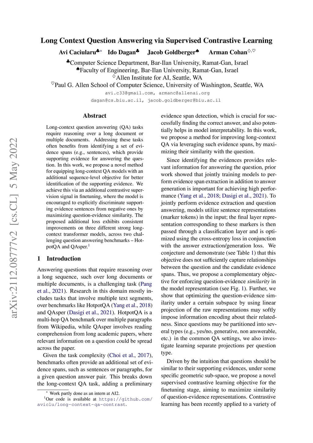 Long Context Question Answering via Supervised Contrastive Learning